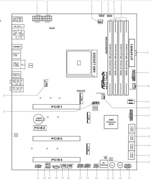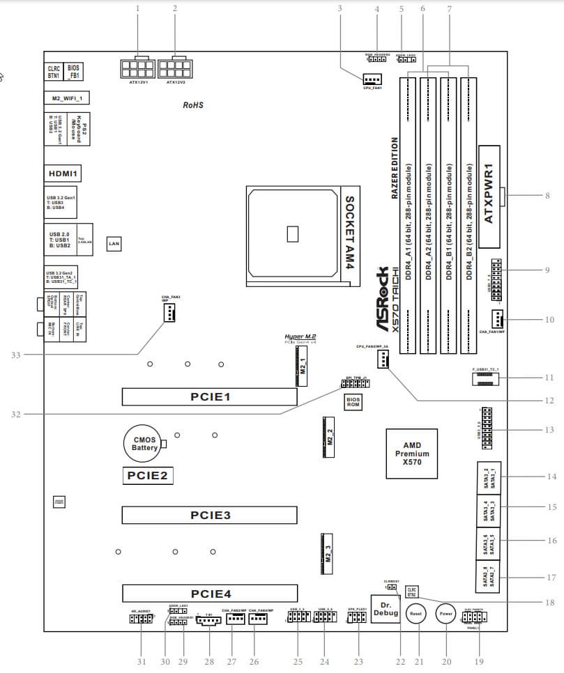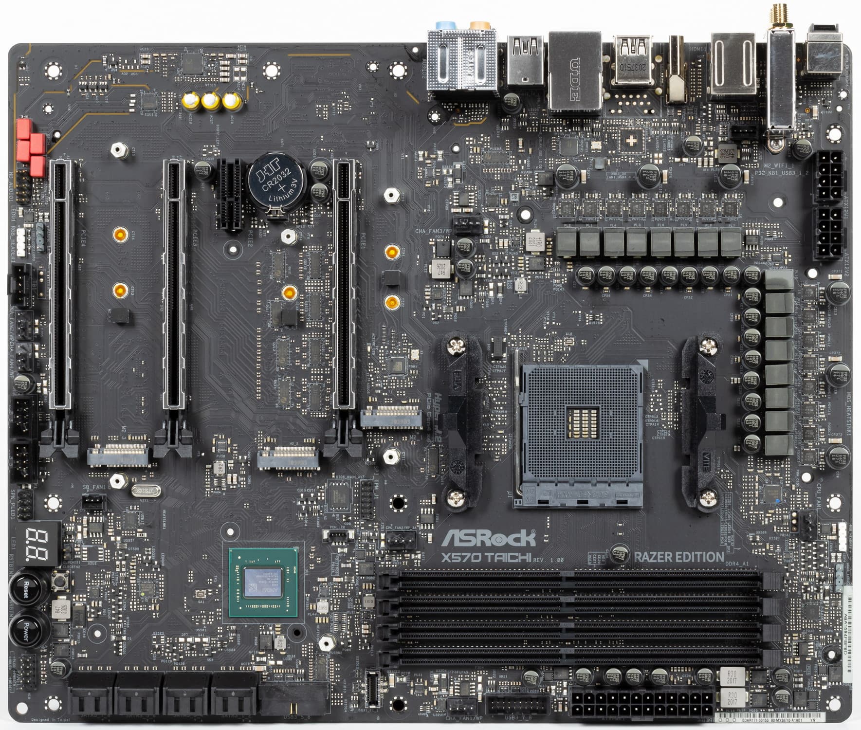 Форм-фактор ATX имеет размеры до 305×244 мм, а E-ATX — до 305×330 мм. Материнская плата ASRock X570 Taichi Razer Edition имеет размеры 305×244 мм, поэтому выполнена в форм-факторе ATX, и на ней имеются 10 монтажных отверстий для установки в корпус.