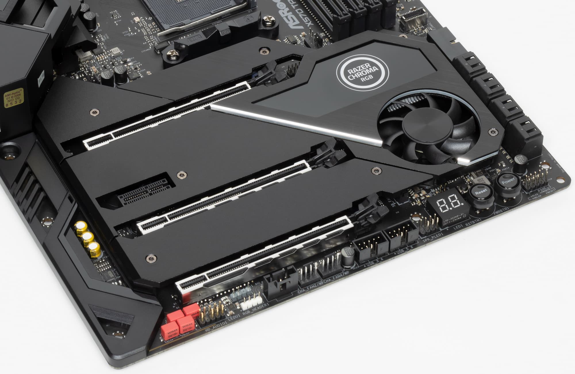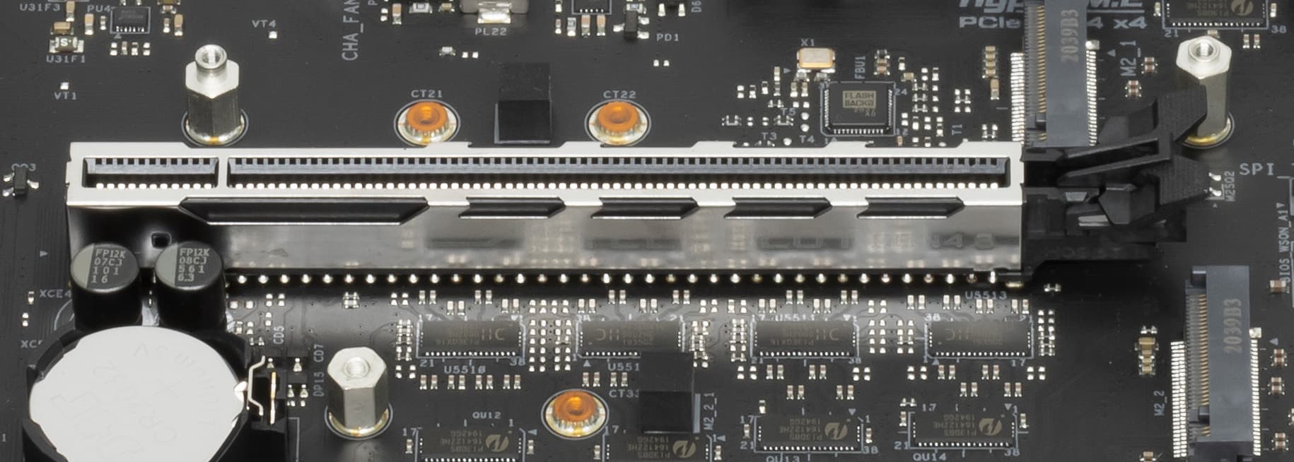 В отличие от слотов для памяти, все три слота PCIe x16_1/2/3 имеют металлическое армирование из нержавеющей стали, которое увеличивает надежность слотов и предохраняет их от электромагнитных помех.
