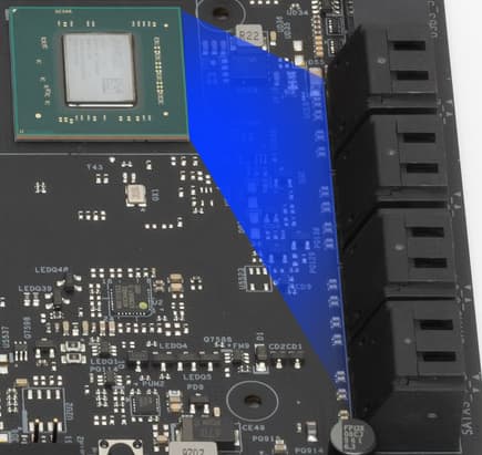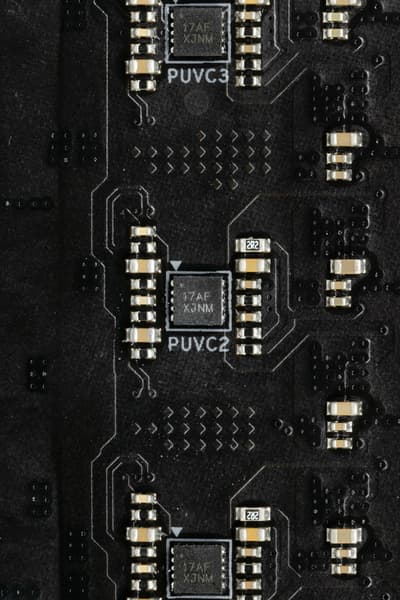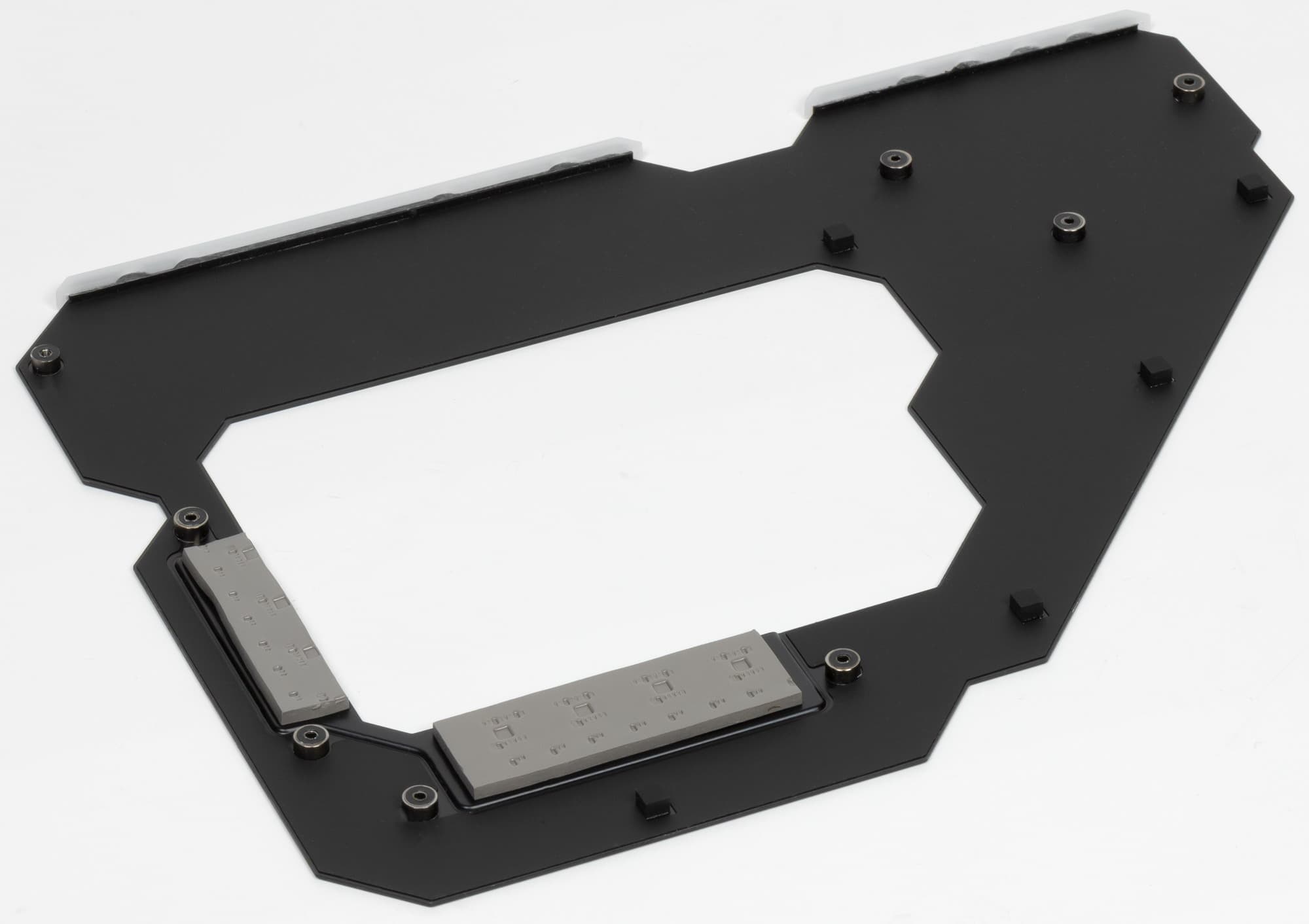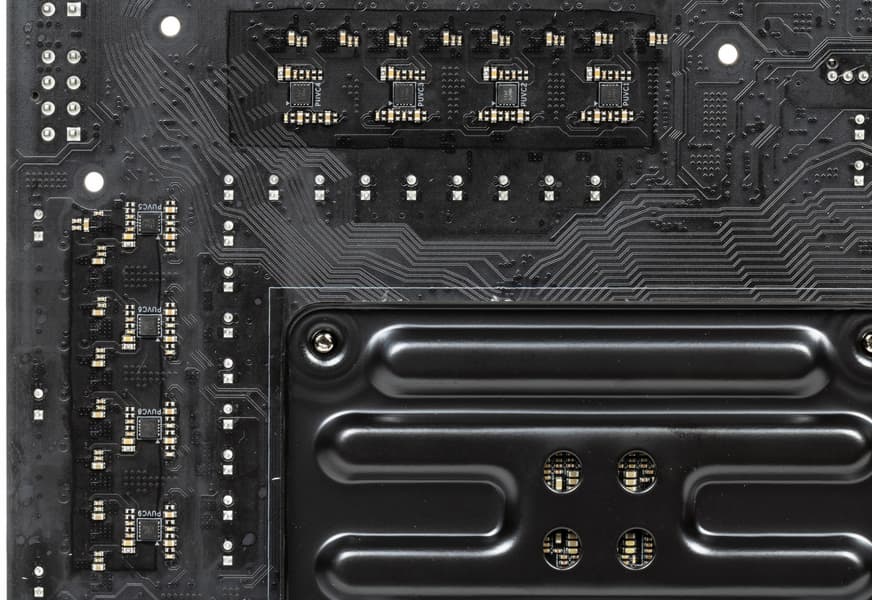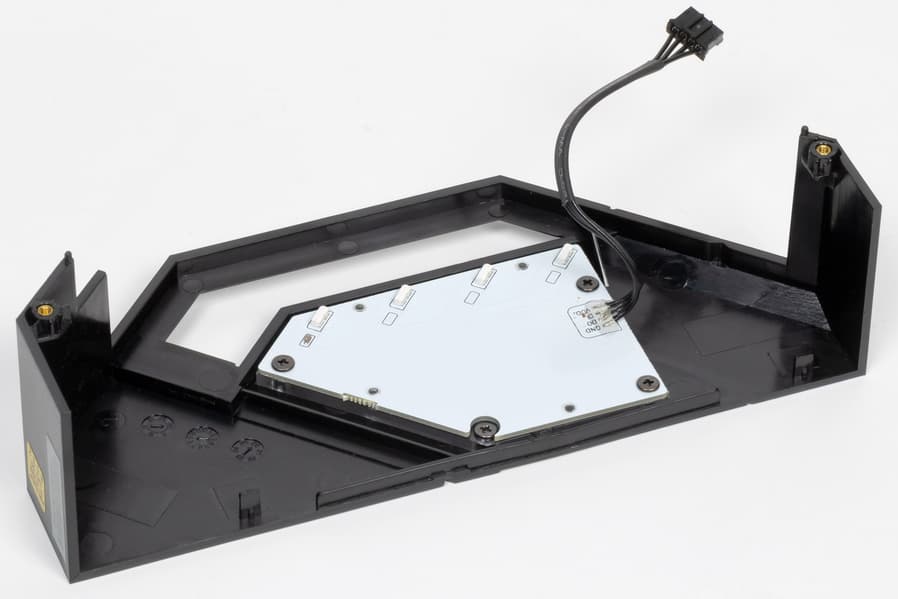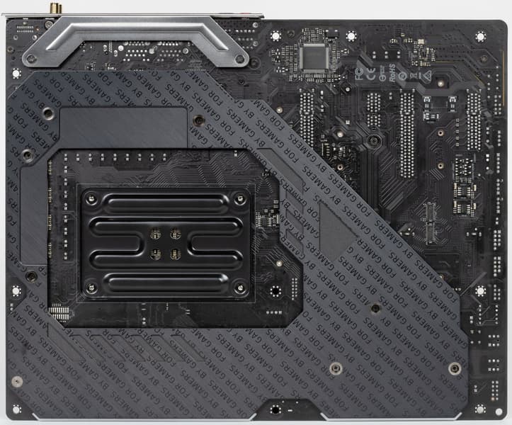 Напомню, что плата усилена пластиной (бэкплейтом) с оборотной стороны. Эта пластина исполняет не только роль защиты, но и усиливает жесткость платы в целом, одна ее сторона несет целую полосу подсветки, а также бэкплейт участвует в охлаждении, прижимаясь через термоинтерфейс к оборотной стороне PCB в районе VRM.