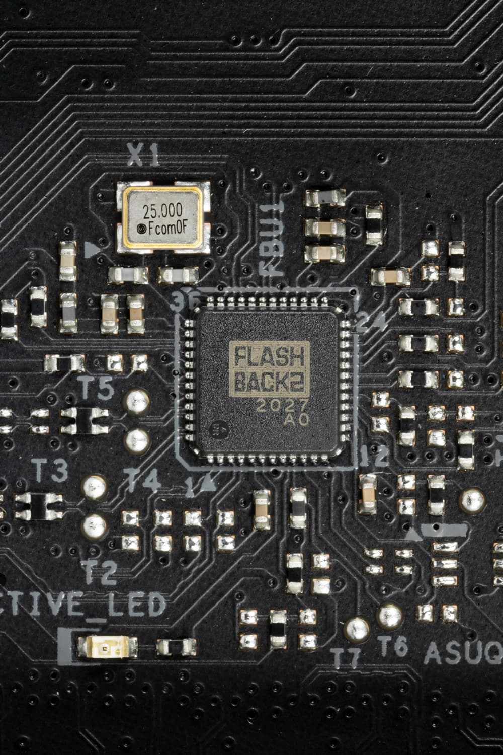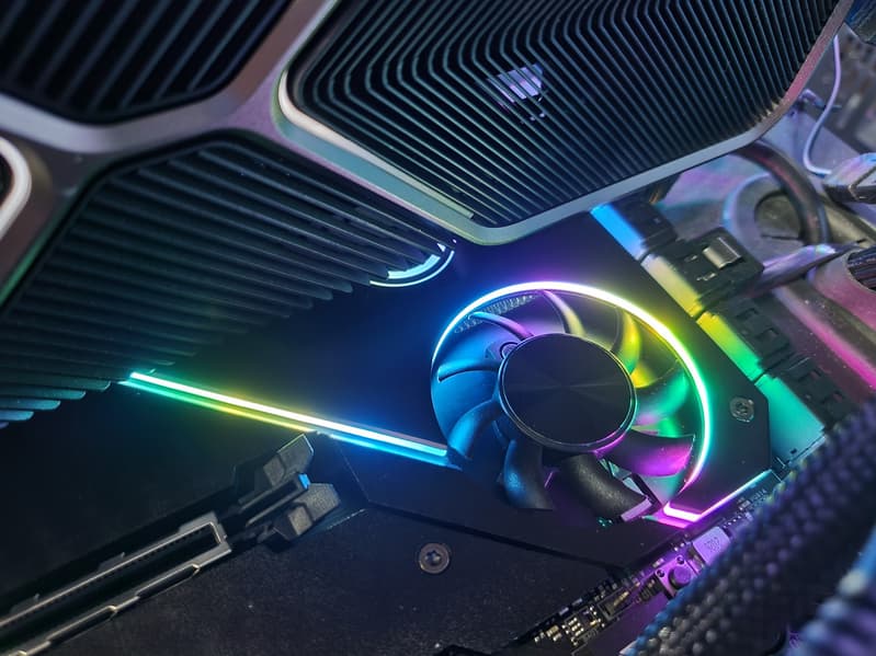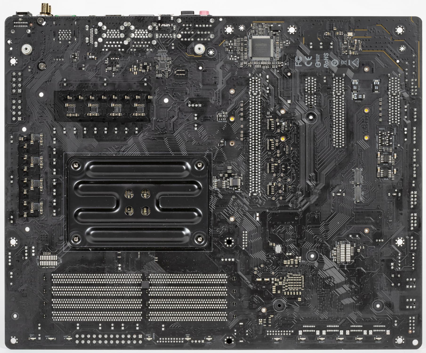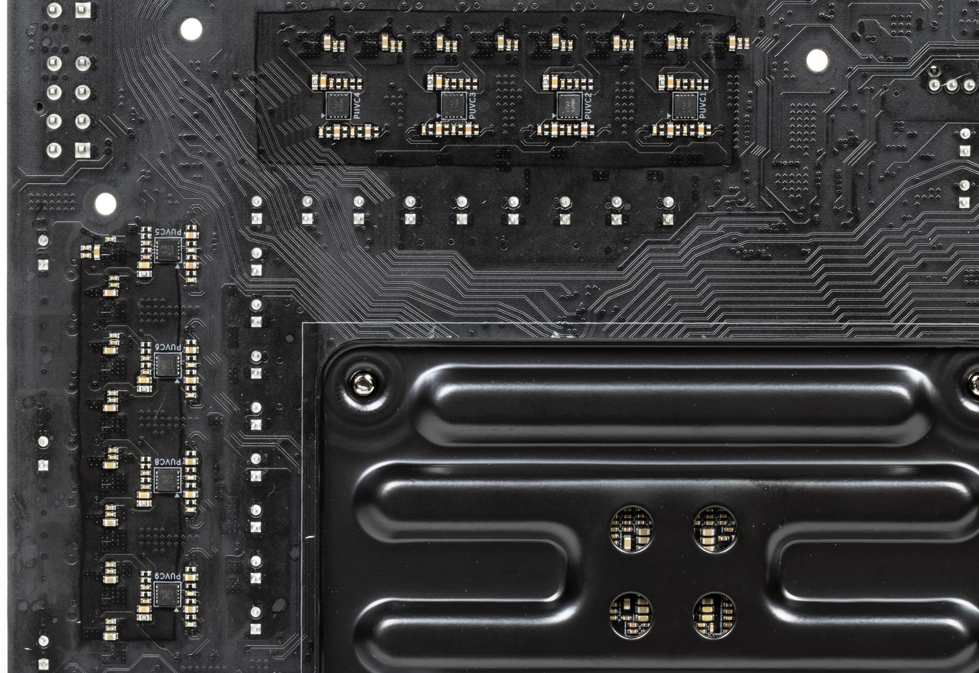 Напомню, что плата усилена пластиной (бэкплейтом) с оборотной стороны. Эта пластина исполняет не только роль защиты, но и усиливает жесткость платы в целом, одна ее сторона несет целую полосу подсветки, а также бэкплейт участвует в охлаждении, прижимаясь через термоинтерфейс к оборотной стороне PCB в районе VRM.