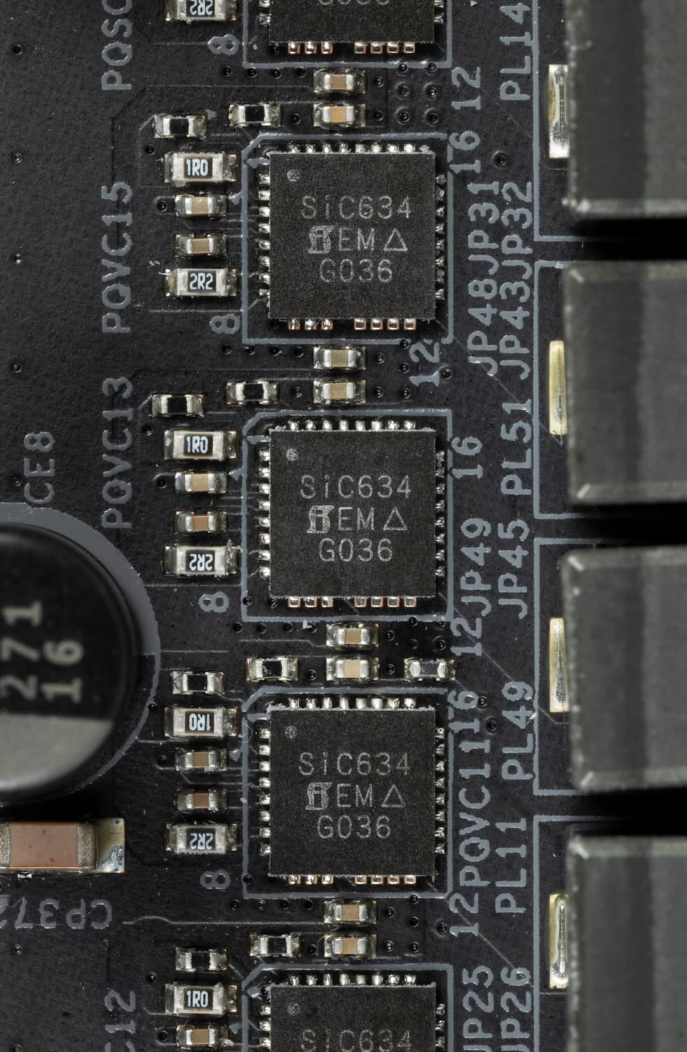 Каждый канал фазы имеет суперферритовую катушку и MOSFET SiC634 от Vishay (до 50А).