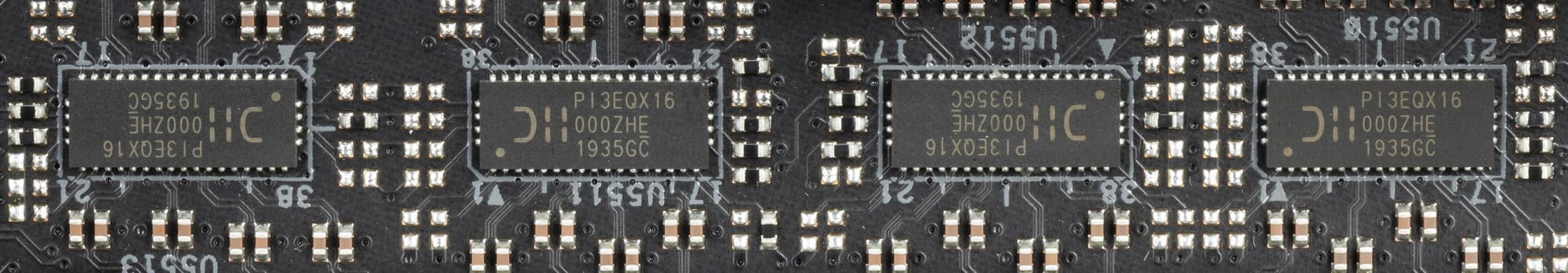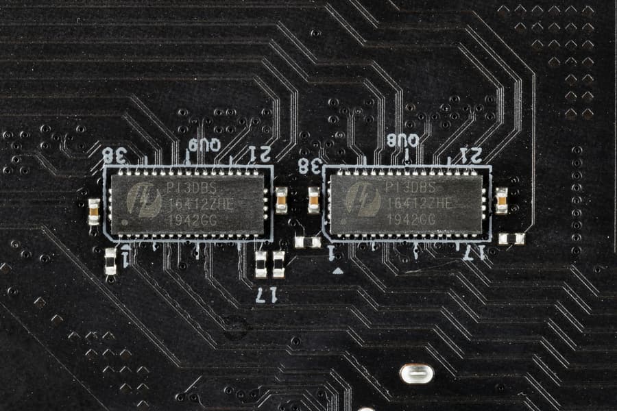 Для поддержания стабильных частот на шине PCIe имеются усилители (ре-драйеры шины PCIe 4.0) от той же компании Diodes Inc. (ex Pericom).