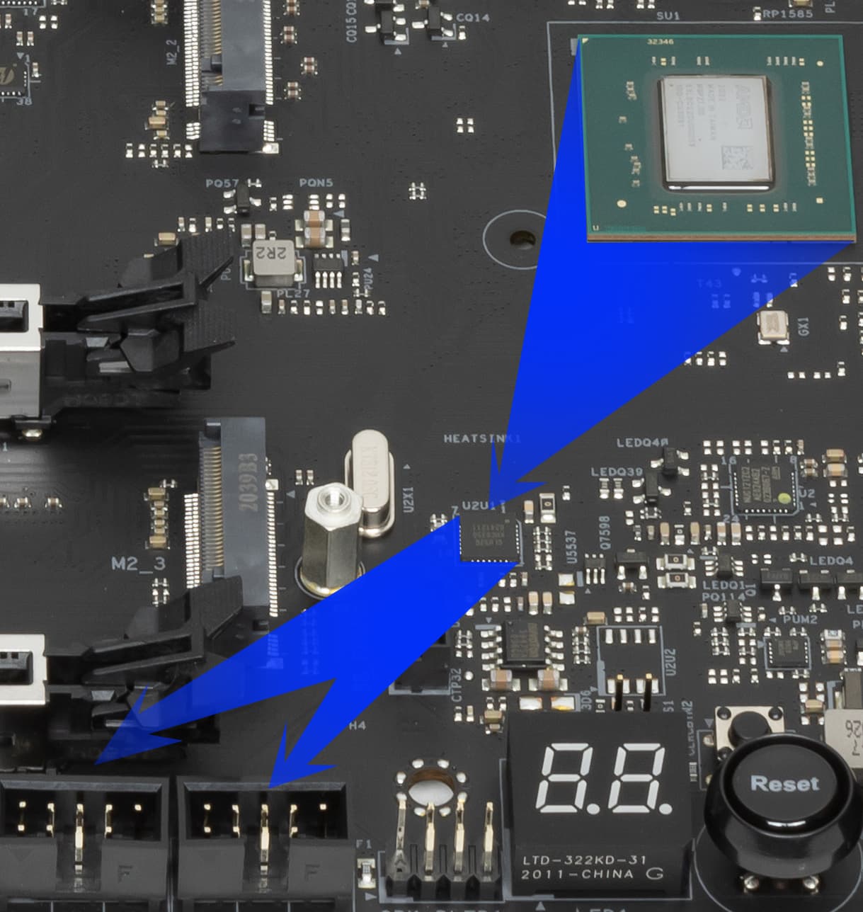 Поскольку имеется «дележка» ресурсов между M.2_3 и PCIe x16_3, то семафором в этом деле выступает пара мультиплексоров от Diodes Inc. (ex Pericom) на оборотной стороне платы.