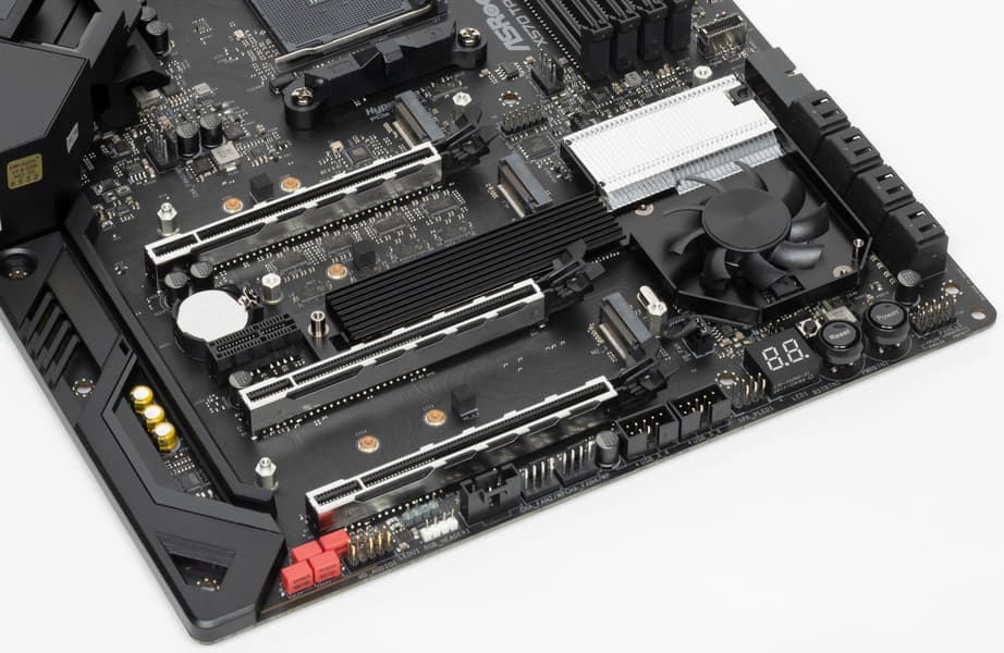 Если про первые PCIe x16_1 и PCIe x16_2 я выше уже рассказал (они подключены к CPU), то третий PCIe x16_3 (четвертый по счету) подключен к X570 и максимально работает в режиме х4. Он делит ресурсы с со слотом M.2_3.
