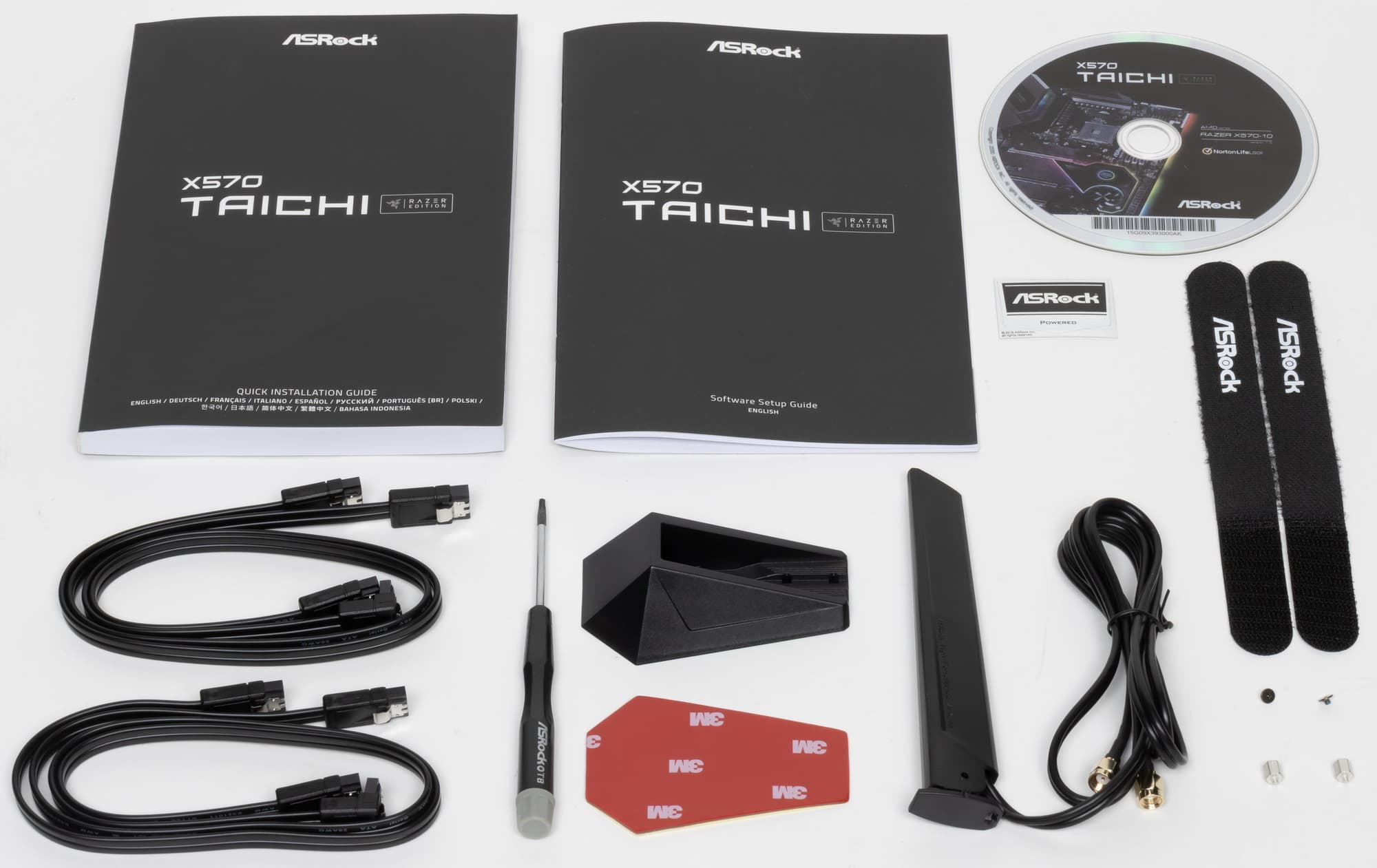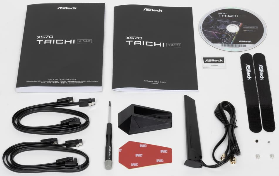 Комплект поставки неплох. Кроме традиционных элементов типа руководства пользователя и кабелей SATA (что уже много лет является обязательным набором ко всем материнкам), имеются: винтики для монтажа модулей M.2, накопитель типа CD c ПО, антенна для беспроводных соединений, бонусные стикер и стяжки, а также фирменная отвертка.