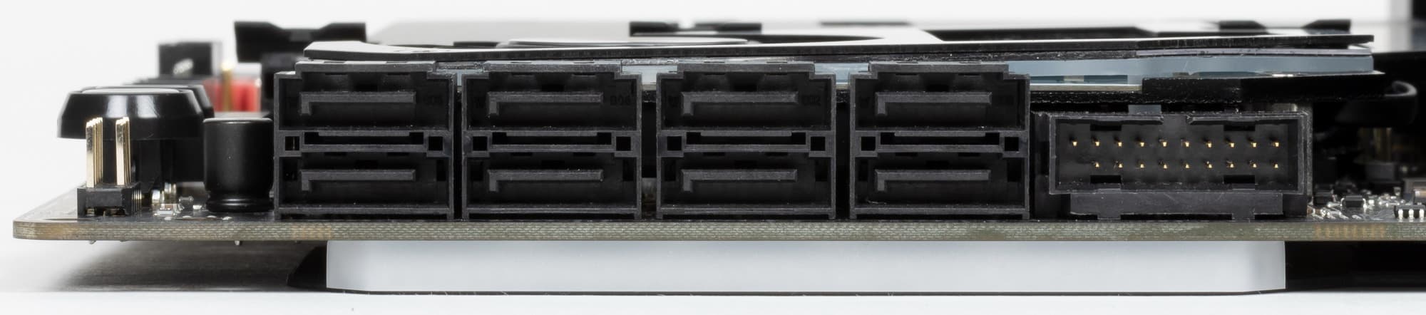 16 линий PCIe оказались занятыми. Замечу особо, что всего у платы 8 портов SATA, а штатно от чипсета распределено всего 4 таких порта. Остальные 4 порта SATA используют свободные PCIe линии.