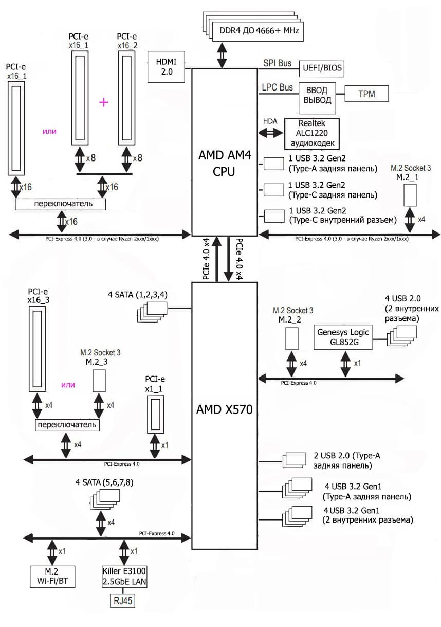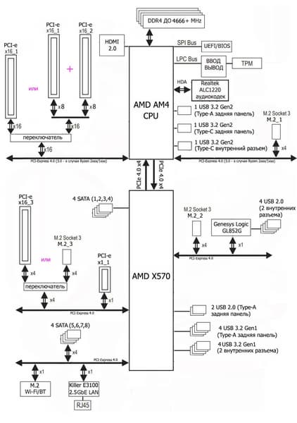 В свою очередь чипсет X570 поддерживает 8 портов USB 3.2 Gen2, 4 порта USB 2.0, 4 порта SATA и 20 линий ввода-вывода, из которых опять же 4 нужны для связи с CPU. Остальные линии могут свободно конфигурироваться.