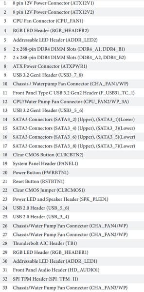| Прочие внутренние элементы | 24-контактный разъем питания ATX 2 8-контактных разъема питания ATX12V 1 слот M.2 (E-key), занят адаптером беспроводных сетей 1 разъем для подключения порта USB 3.2 Gen2 Type-C 2 разъема для подключения 4 портов USB 3.2 Gen1 2 разъема для подключения 4 портов USB 2.0 6 разъемов для подключения 4-контактных вентиляторов (поддержка помп ЖСО) 2 разъема для подключения неадресуемой RGB-ленты 2 разъема для подключения адресуемой ARGB-ленты 1 разъем аудио для передней панели корпуса 1 разъем TPM/SPI TPM 1 разъем Thunderbolt 3 2 разъема для подключения управления с передней панели корпуса 1 кнопка включения питания (Power) 1 кнопка перезагрузки (Reset) 1 кнопка для сброса CMOS 1 перемычка сброса CMOS |