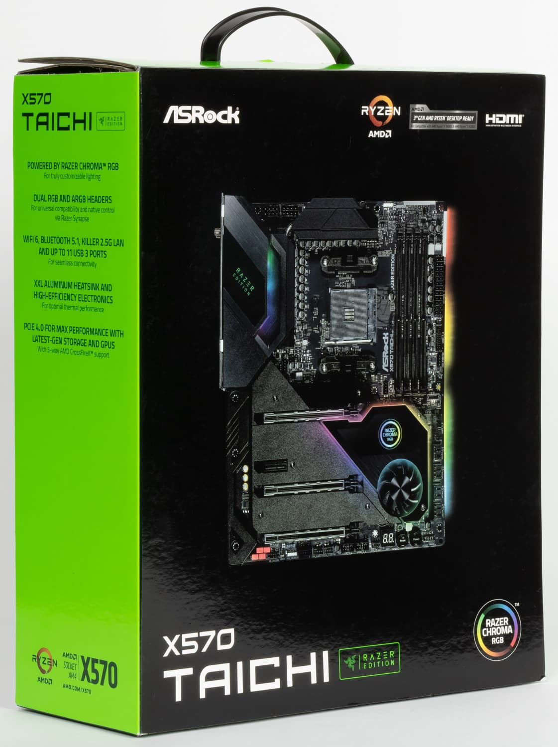 ASRock X570 Taichi Razer Edition поставляется в толстой картонной глянцевой коробке с откидной крышкой (за которой через пластиковое окно видна сама плата) и ручкой. Внутри коробки есть свои две коробки уровнем ниже: самой материнской платы, и остального комплекта.