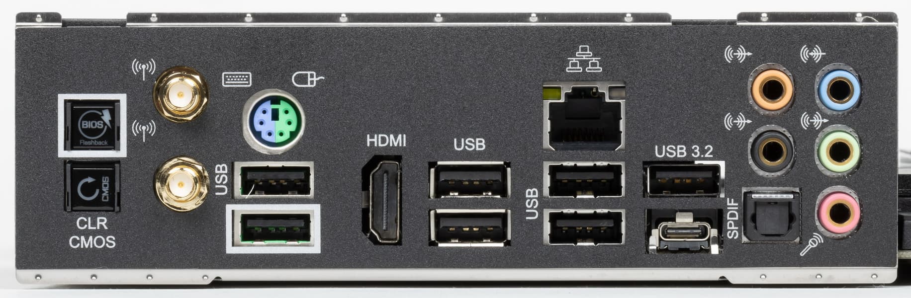 | Разъемы на задней панели | 1 × USB 3.2 Gen2 (Type-C) 1 × USB 3.2 Gen2 (Type-A) 4 × USB 3.2 Gen1 (Type-A) 2 × USB 2.0 (Type-A) 1 × HDMI 2.0 1 × RJ-45 5 аудиоразъемов типа миниджек 1 × S/PDIF (оптический, выход) 2 антенных разъема кнопка сброса CMOS кнопка перепрошивки BIOS — FlashBack |