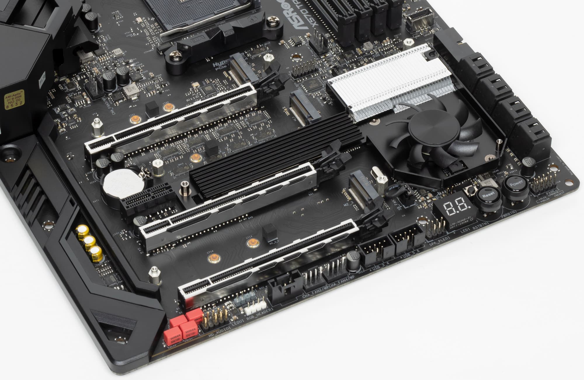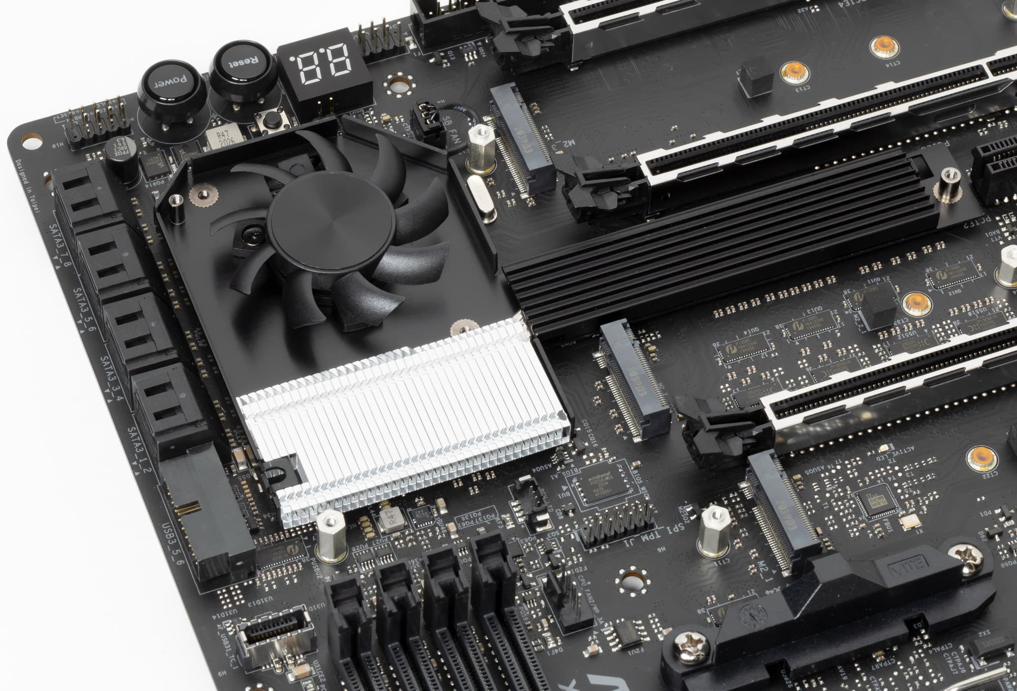 Все три M.2 слота имеют радиаторы. При этом M.2_1 и M.2_3 имеют по раздельному радиатору, а у M.2_2 радиатор также является крышкой для чипсетного радиатора.