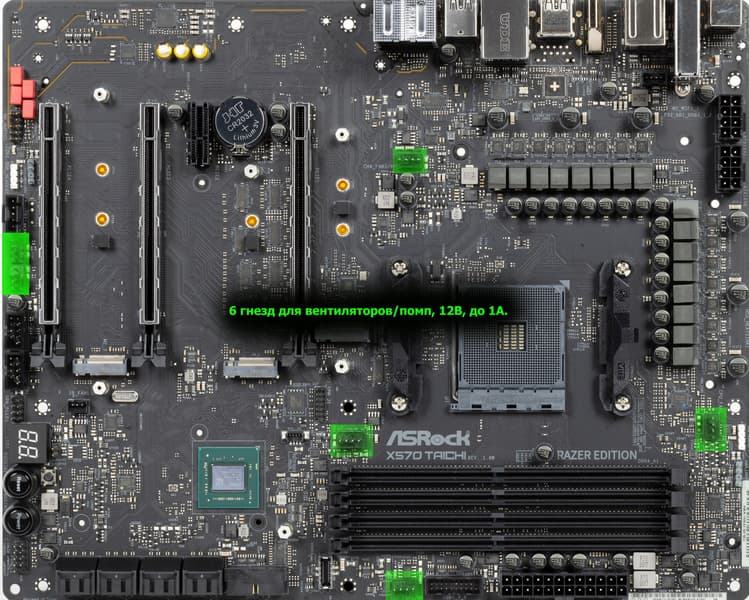 Конечно, и функциональность у ASRock X570 Taichi Razer Edition на соответствующем уровне. Плата имеет 17 портов USB разных видов (включая 3 USB3 Gen2), 3 слота PCIe х16 (из которых первые два могут работать в режимах x16+0 и x8+x8, а третий дает возможность установить дополнительные карты с интерфейсом PCIe x4) и слот PCIe x1, 3 слота M.2, 8 портов SATA. Плата предлагает 6 разъемов для подключения вентиляторов и помп, радиаторами оснащены все накопители в слотах M.2. Сетевых подключений два: проводной 2,5-гигабитный проводной контроллер и Wi-Fi 6.