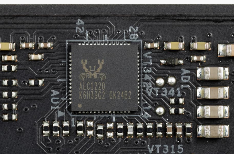 Как и во всех современных материнских платах звуком заведует аудиокодек Realtek ALC1220. Он обеспечивает вывод звука по схемам до 7.1.