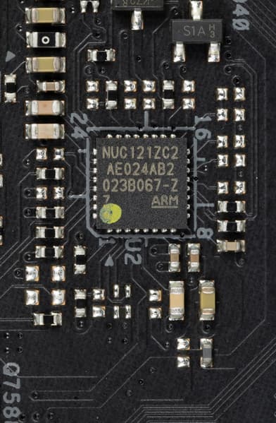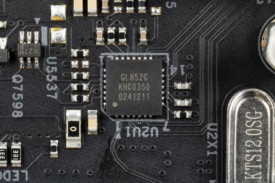 - 6 портов USB 2.0/1.1: 4 реализованы через контроллер Genesys Logic GL852G (на него потрачена 1 линия PCIe от X570) и представлены двумя внутренними разъемами (каждый на 2 порта); еще 2 реализованы через X570 и представлены портами Type-A на задней панели.