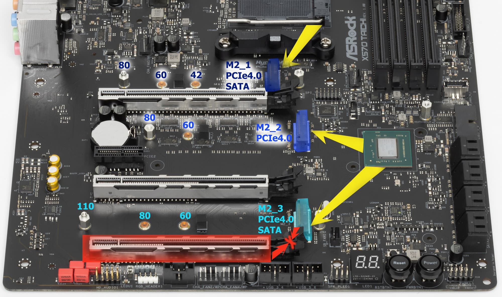 Оба слота M.2_2 и M.2_3 получают данные уже от чипсета X570. При этом только M.2_3 поддерживает модули с любым интерфейсом и размерами 2260/2280/22110, а вот слот M.2_2 принимает модули только с интерфейсом PCIe 3.0/4.0 и размерами 2260/2280.