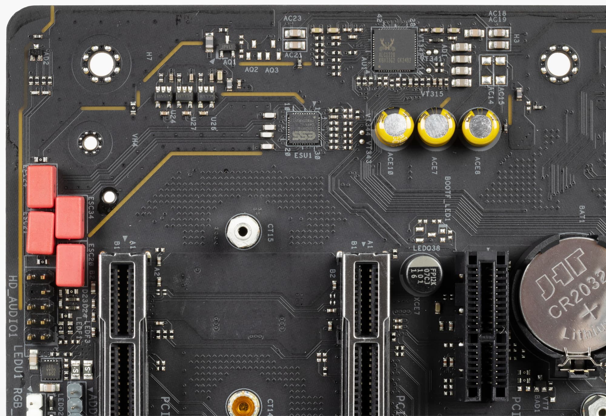 Аудиотракт вынесен на угловую часть платы, не пересекается с другими элементами. Разумеется, левый и правый каналы разведены по разным слоям печатной платы. Все аудиоразъемы на задней панели имеют привычную нам цветовую окраску и позолочены изнутри.