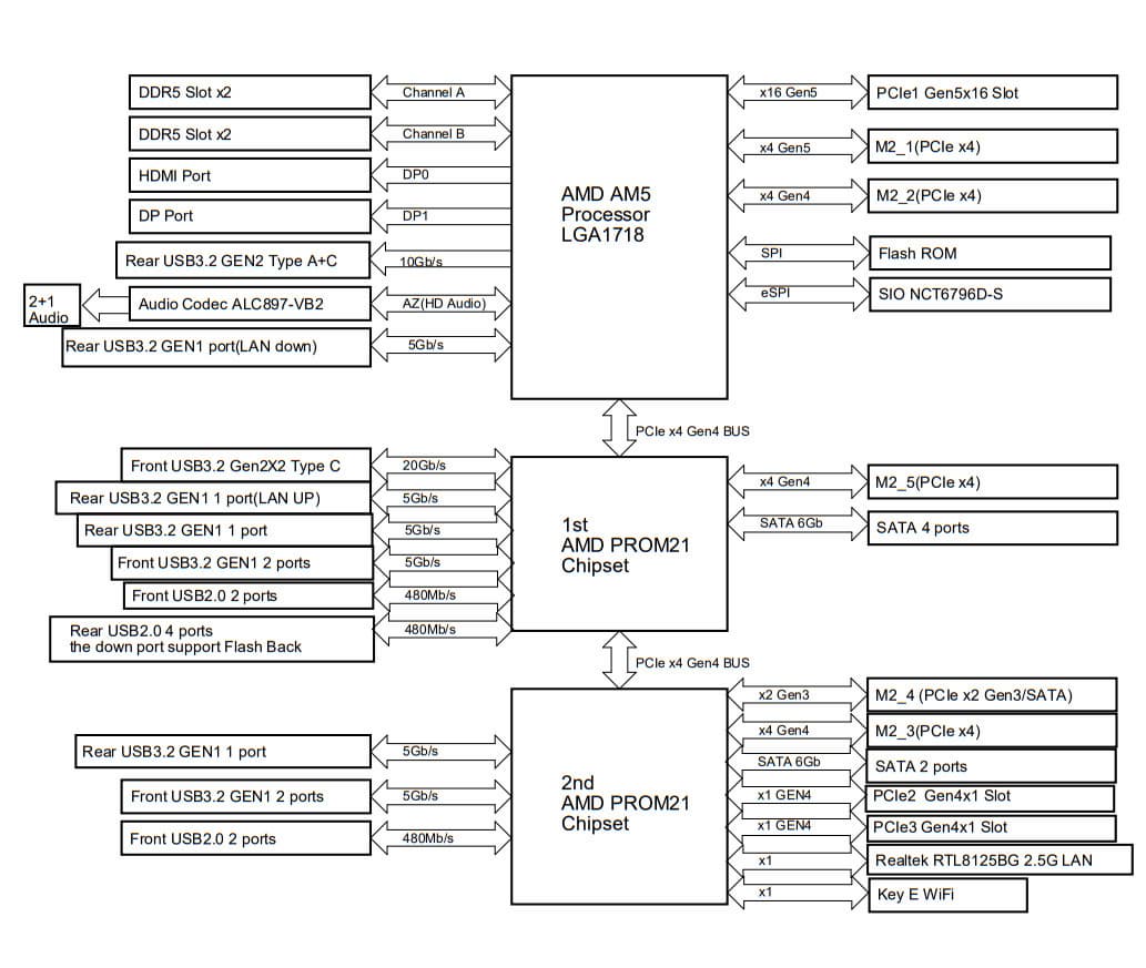 Чипсет X670/X670E получил сильно больше как портов, так и линий PCIe, нежели предшественник, и чтобы не получить одну очень горячую микросхему, памятуя проблему чипсета X570, которому на начальных порах требовался весьма шумный вентилятор, AMD разделила функциональность на две микросхемы по принципу: «восходящее» и «нисходящее» соединения. «Восходящий» чип подключен к процессору через PCIe 4.0 x4, а «нисходящий» к «восходящему» через другое соединение PCIe 4.0 x4. Обе микросхемы произведены силами ASMedia.