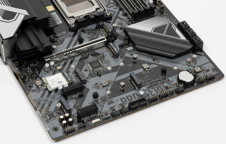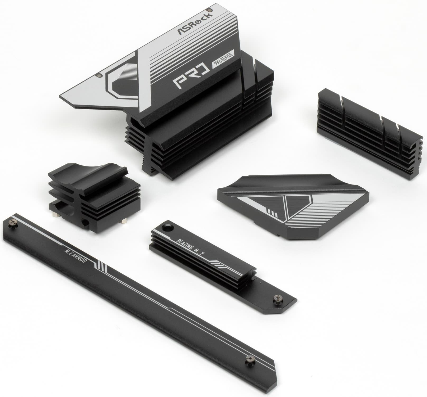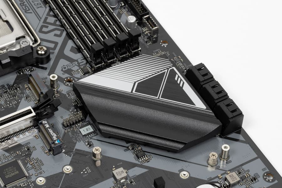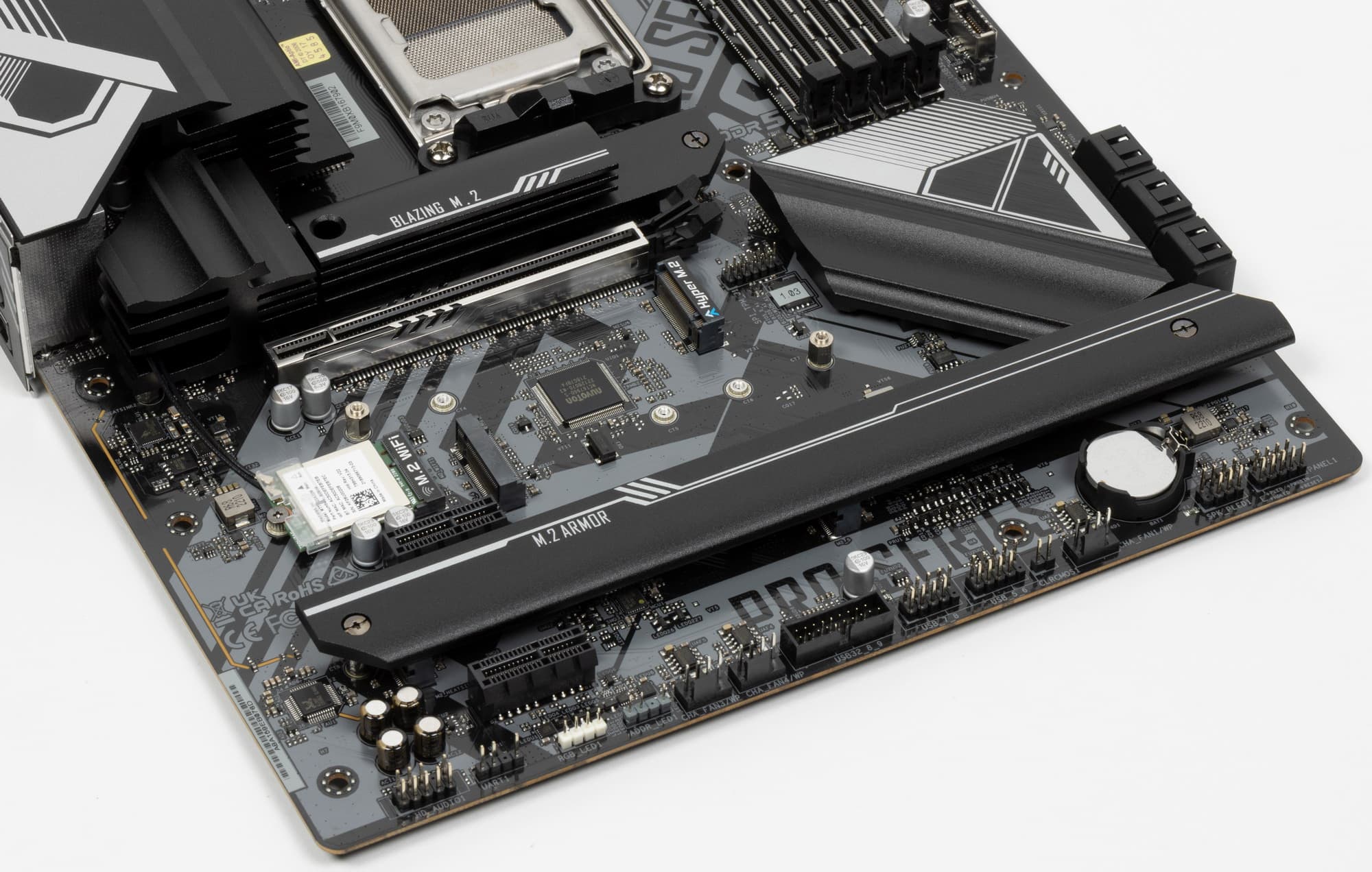 Все потенциально сильно греющиеся элементы имеют свои собственные радиаторы. Чипы X670E разнесены по разным сторонам платы, и каждый имеет свой радиатор.
