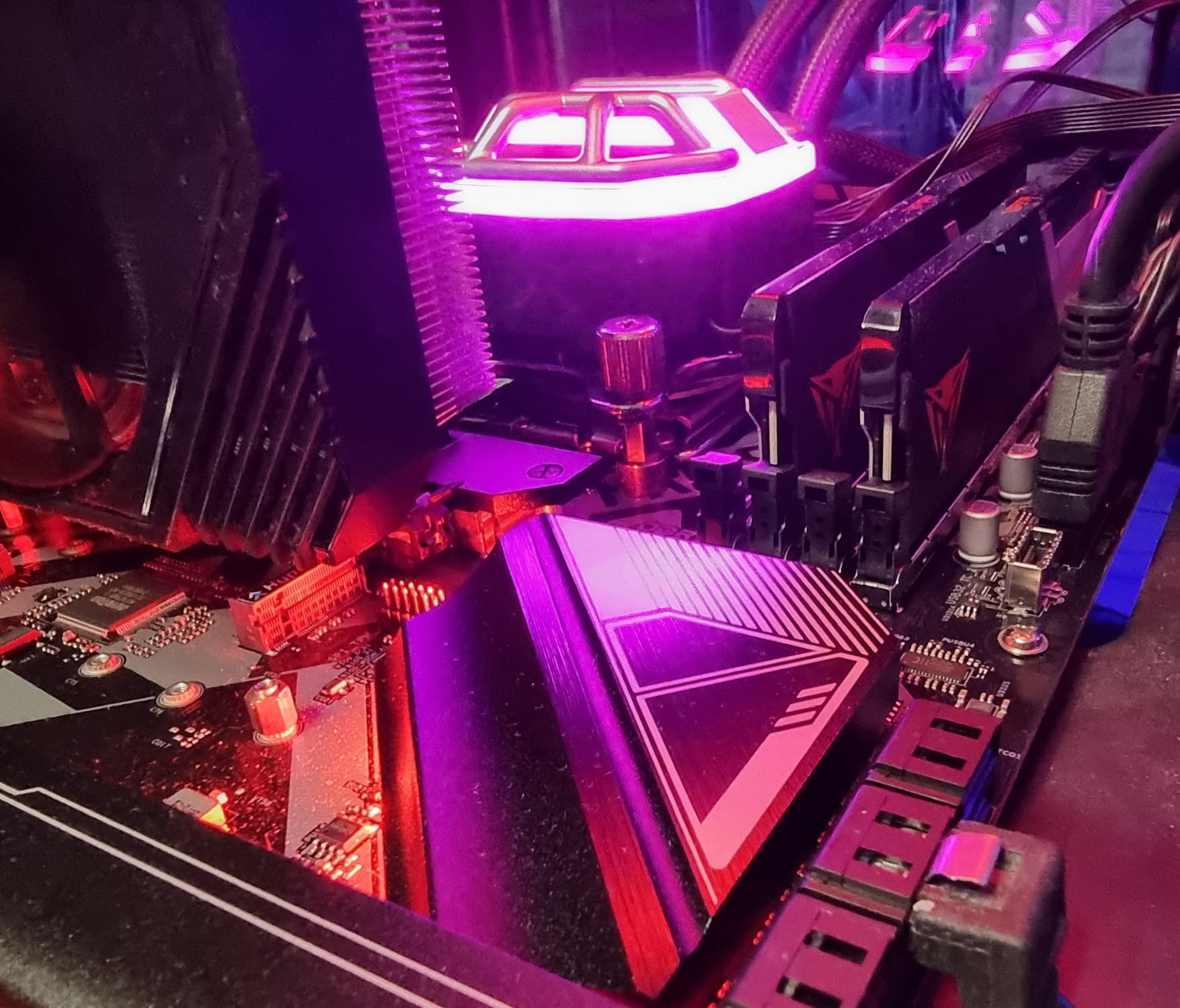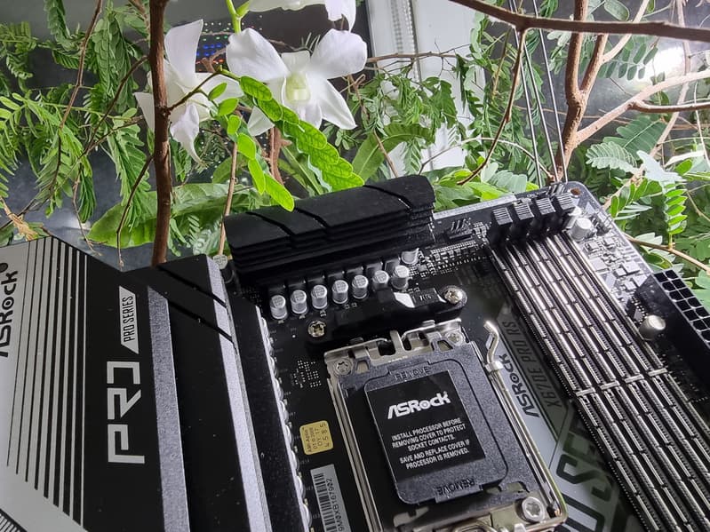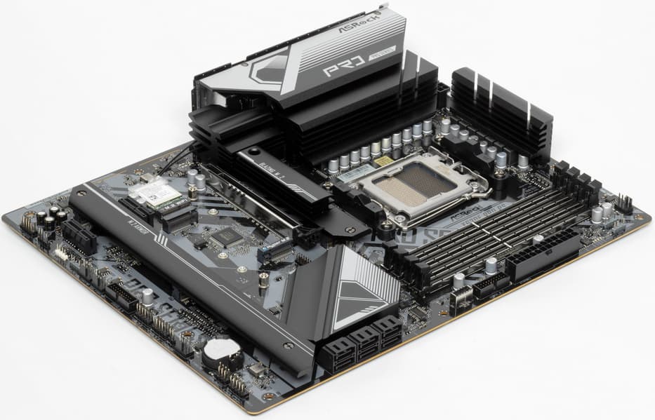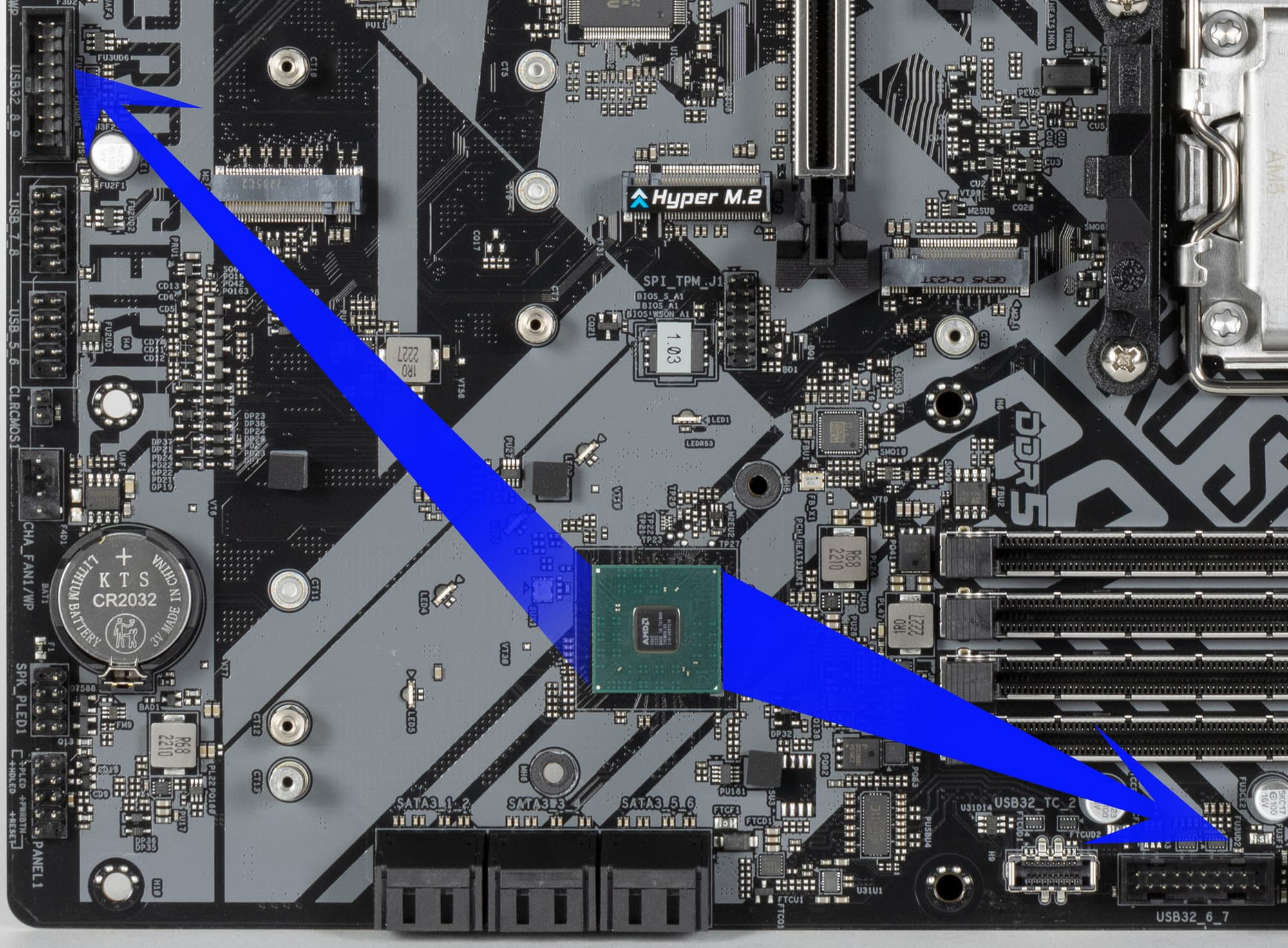 Все потенциально сильно греющиеся элементы имеют свои собственные радиаторы. Чипы X670E разнесены по разным сторонам платы, и каждый имеет свой радиатор.