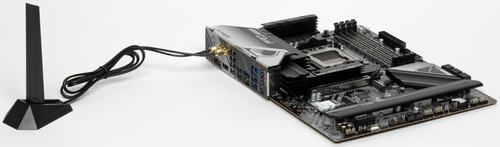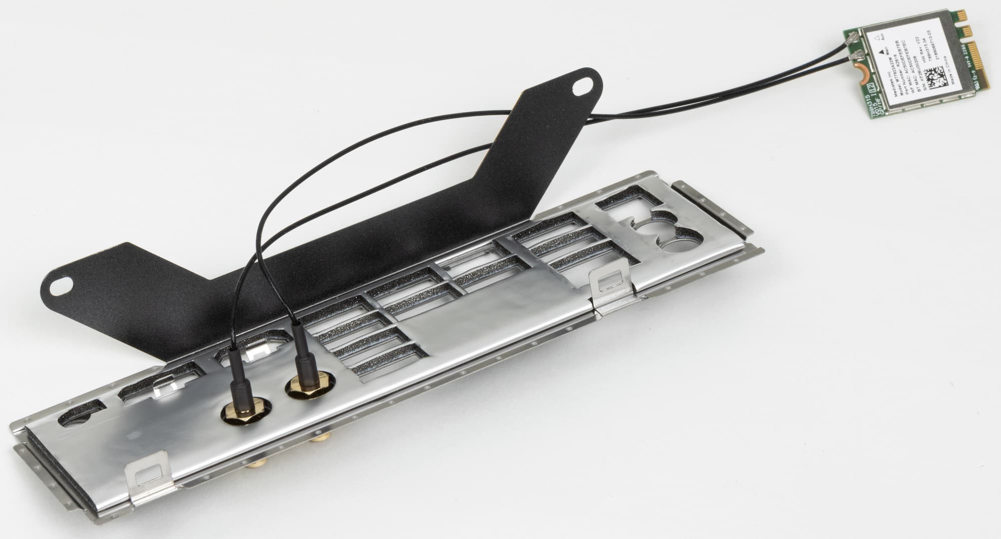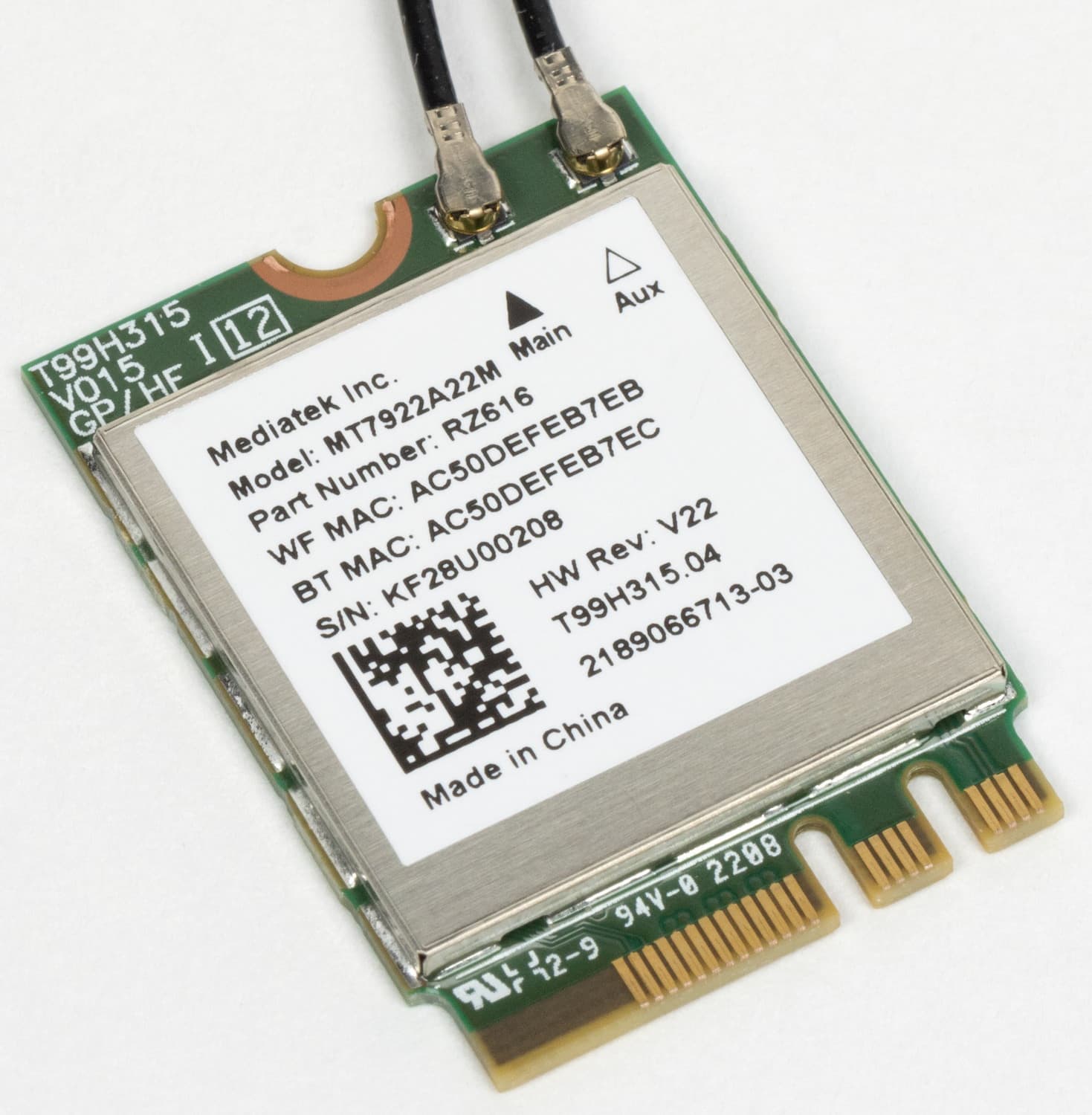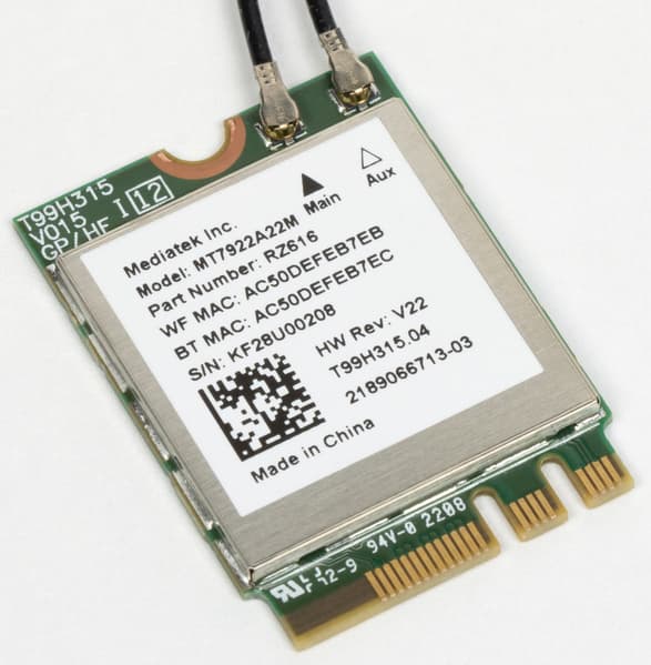 Имеется и комплексный беспроводной адаптер на контроллере MediaTek MT7922A22M (AMD RZ616), через который реализованы Wi-Fi 6E (802.11a/b/g/n/ac/ax) и Bluetooth 5.2. Он установлен в слот M.2 (E-key), и его разъемы для привинчивания выносных антенн выведены на заднюю панель .