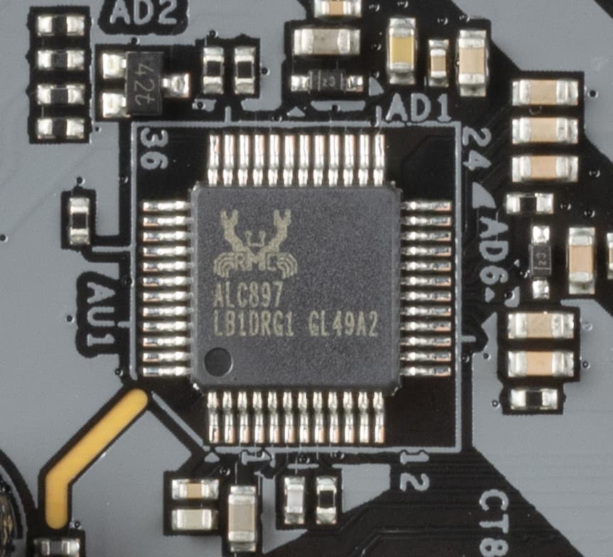 Мы знаем, что уже достаточно давно в большинстве современных материнских платах звуком заведовал аудиокодек Realtek ALC1220. Он обеспечивает вывод звука по схемам до 7.1 с разрешением до 24 бит / 192 кГц. Мы видели уже и ALC4082 того же производителя с улучшенными характеристиками 32 бит / 384 кГц. Однако в данном случае мы видим возврат к старенькому ALC897.