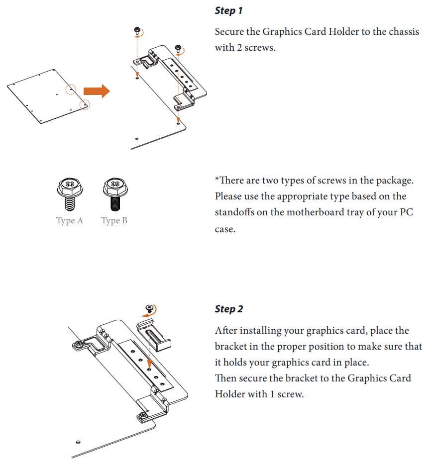 Подставка для видеокарты крепится к корпусу (с краю плато, несущего матплату). По сути поддерживает край видеокарты, находящийся рядом с корпусом, что, конечно же, помогает видеокарте стоять в слоте ровно, однако не спасает от перекоса самого дальнего угла тяжелой карты.