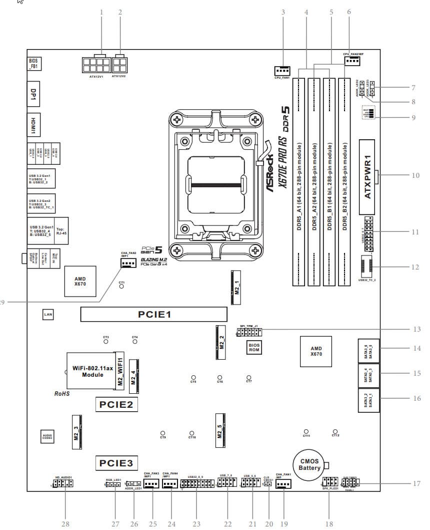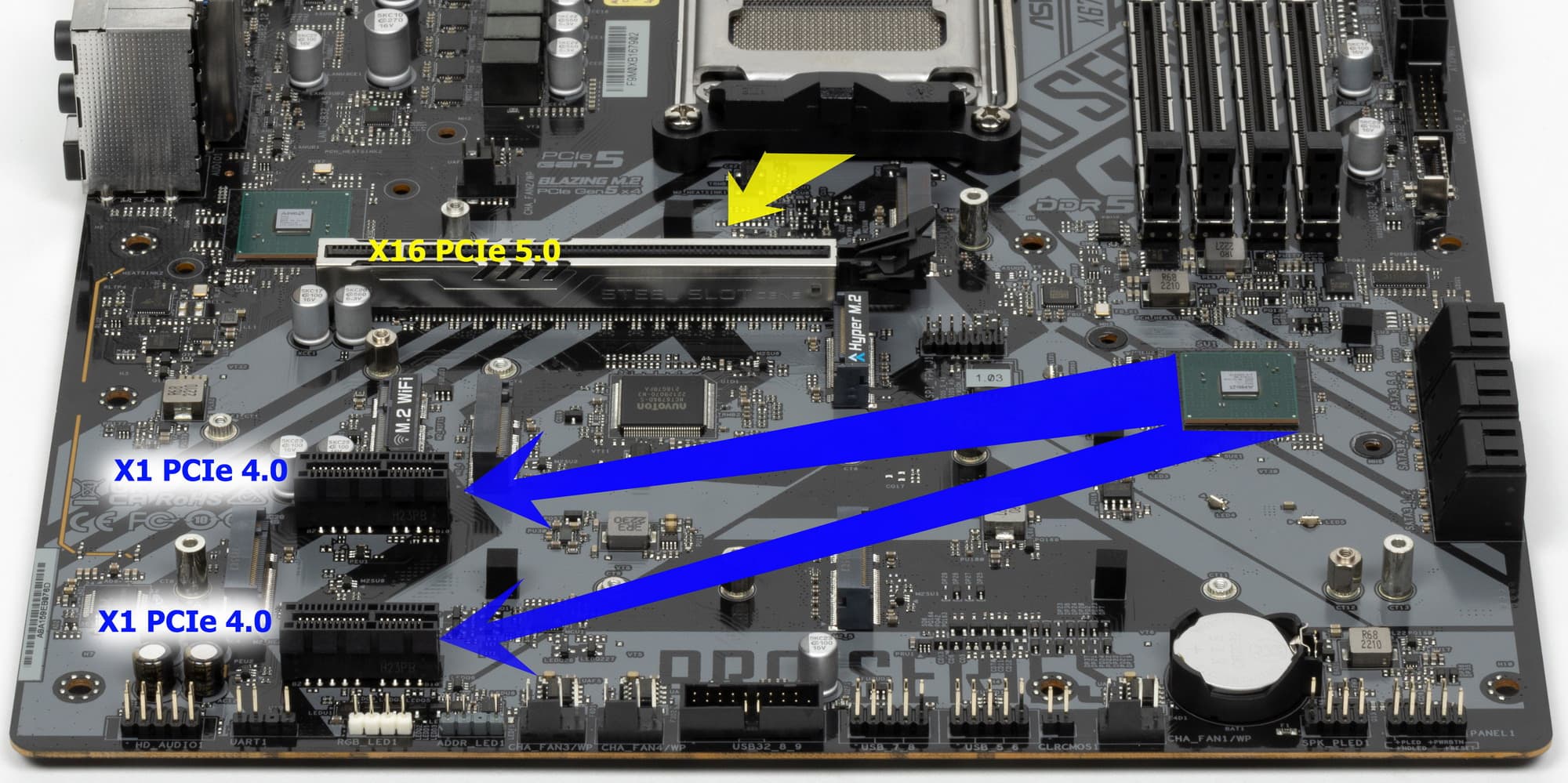 Выше приведена полная схема распределения ресурсов по слотам PCIe. Всего на плате есть 3 слота PCIe: один PCIe x16 PCIe 5.0, получающий данные от процессора, и два «коротких» слота, получающие данные от X670E и работающие по схеме x1 и x1.