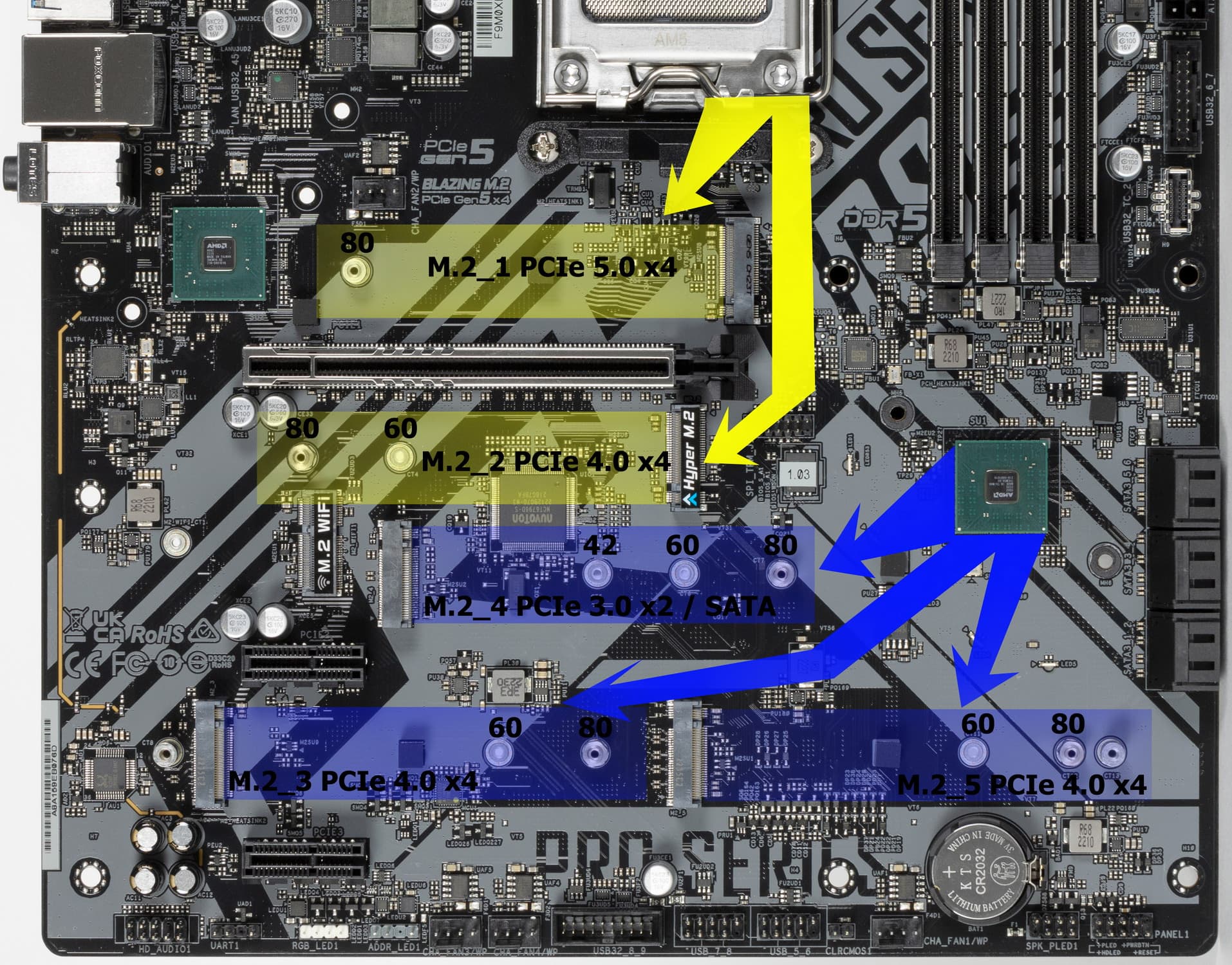 М.2_1 и М.2_2 получают данные от CPU, а остальные – от X670E.