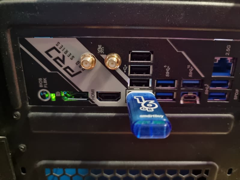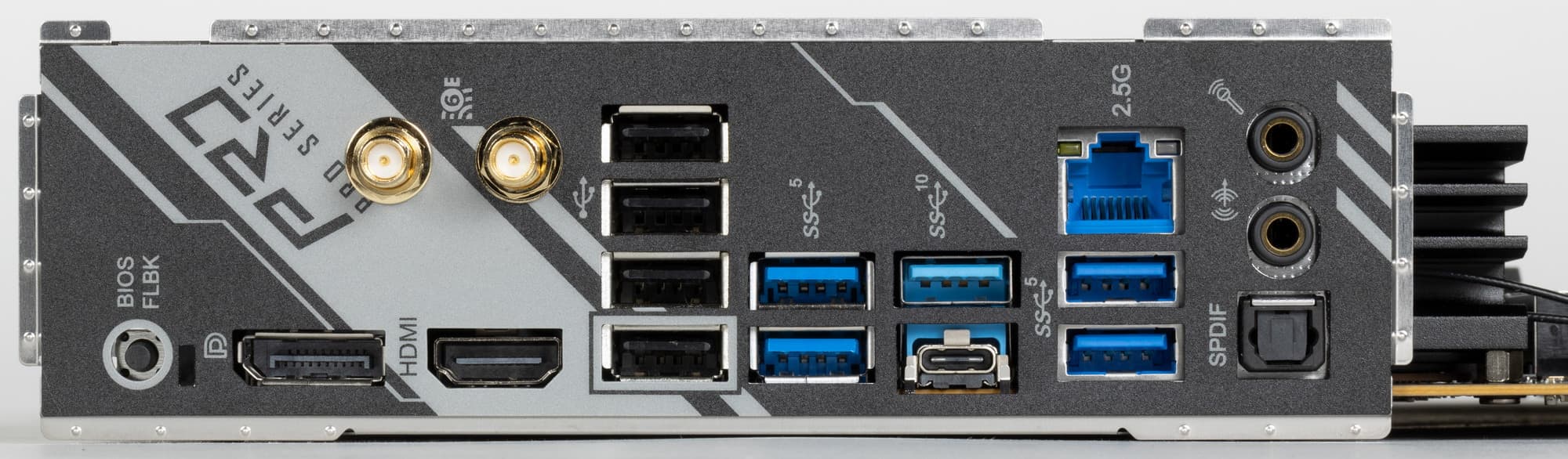 | Разъемы на задней панели | 1 × USB 3.2 Gen2 (Type-C) 1 × USB 3.2 Gen2 (Type-A) 4 × USB 3.2 Gen1 (Type-A) 4 × USB 2.0 (Type-A) 1 × RJ-45 2 аудиоразъема типа миниджек 1 × S/PDIF (оптический, выход) 1 × DisplayPort 1 × HDMI 2 антенных разъема кнопка перепрошивки BIOS — Flashback |