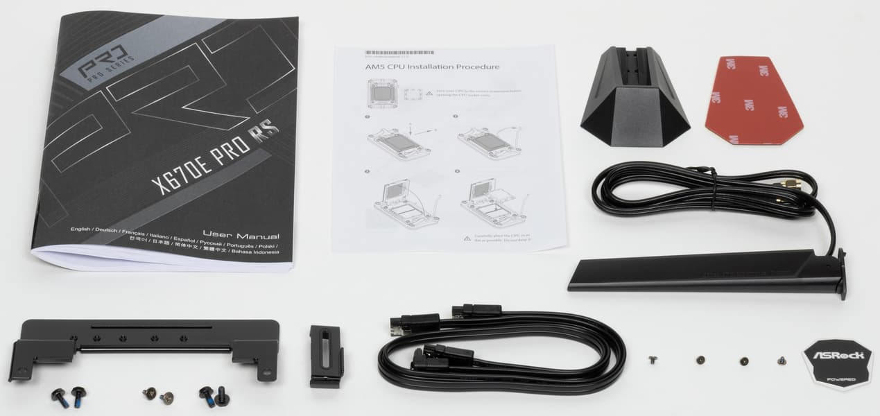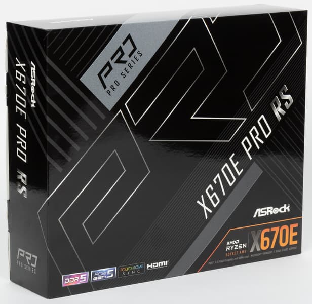 ASRock X670E Pro RS поставляется в традиционной для ASRock коробке из жесткого картона с глянцевой суперобложкой. Комплект размещен под платой в отдельном отсеке.