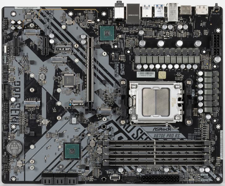 У ASRock X670E Pro RS имеется 19 портов USB разных видов, включая 1 самый быстрый USB 3.2 Gen2×2. Плата предлагает слот PCIe х16 (он получает от процессора 16 линий PCIe 5.0) и аж 5 слотов M.2, два из которых подключены напрямую к процессору линиями PCIe 5.0 и 4.0, а остальные — к чипсету линиями PCIe 4.0 и 3.0. Еще у платы есть 2 слота PCIe x1.