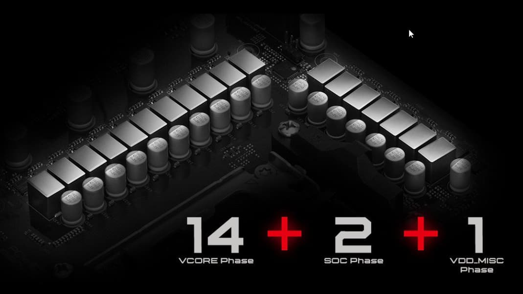 Внешне схема питания выглядит как 14+2+1: 14 фаз — ядро процессора, 2 фазы — SoC (I/O-чиплет Ryzen), 1 фаза — VDD_MISC (вывод встроенной графики).
