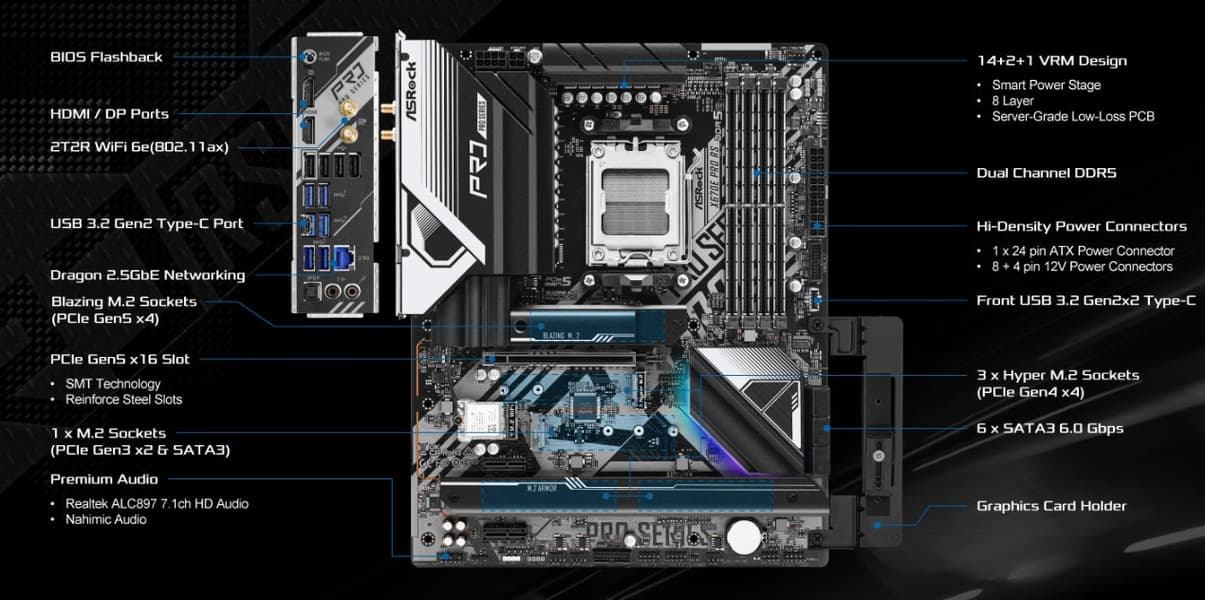 ASRock X670E Pro RS поддерживает процессоры AMD поколения 7000, выполненные под разъем (сокет) AM5.