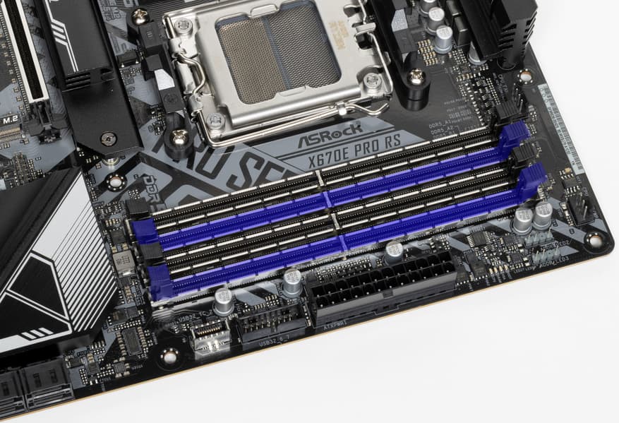 Для установки модулей памяти на плате имеется четыре DIMM-слота (для работы памяти в Dual Channel в случае использования всего 2 модулей их следует устанавливать в А2 и B2 (выделены синим цветом)). Плата поддерживает небуферизованную память DDR5, а максимальный объем памяти составляет 128 ГБ. Поддерживаются профили XMP и Expo.