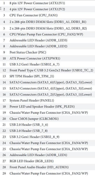 | Прочие внутренние элементы | 24-контактный разъем питания ATX 1 8-контактный разъем питания EPS12V 1 4-контактный разъем питания EPS12V 1 слот M.2 (E-key), занят адаптером беспроводных сетей 1 разъем для подключения порта USB 3.2 Gen2x2 Type-C 2 разъема для подключения 4 портов USB 3.2 Gen1 2 разъема для подключения 4 портов USB 2.0 6 разъемов для подключения 4-контактных вентиляторов и помп ЖСО 1 разъем для подключения неадресуемой RGB-ленты 3 разъема для подключения адресуемой ARGB-ленты 1 разъем аудио для передней панели корпуса 1 разъем для сброса CMOS 1 разъем TPM для систем безопасности 2 разъемa для подключения управления с передней панели корпуса |