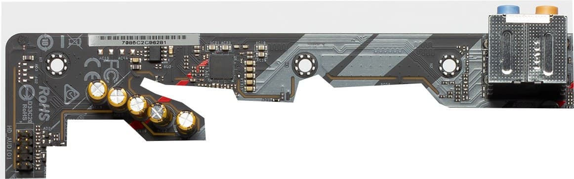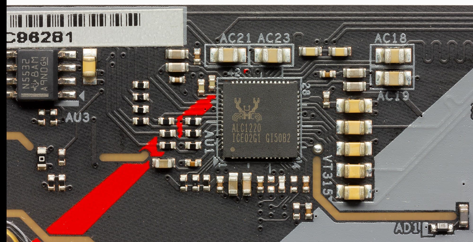 Аудиотракт вынесен на угловую часть платы, не пересекается с другими элементами, левый и правый каналы разведены по разным слоям печатной платы. Все аудиоразъемы имеют позолоченное покрытие (маркетинговый ход для такого рода плат), при этом сохранена привычная цветовая окраска разъемов (которая неплохо помогает подключать нужные штекеры без вглядывания в их наименование).