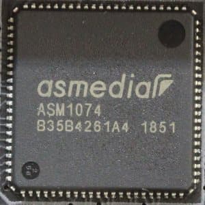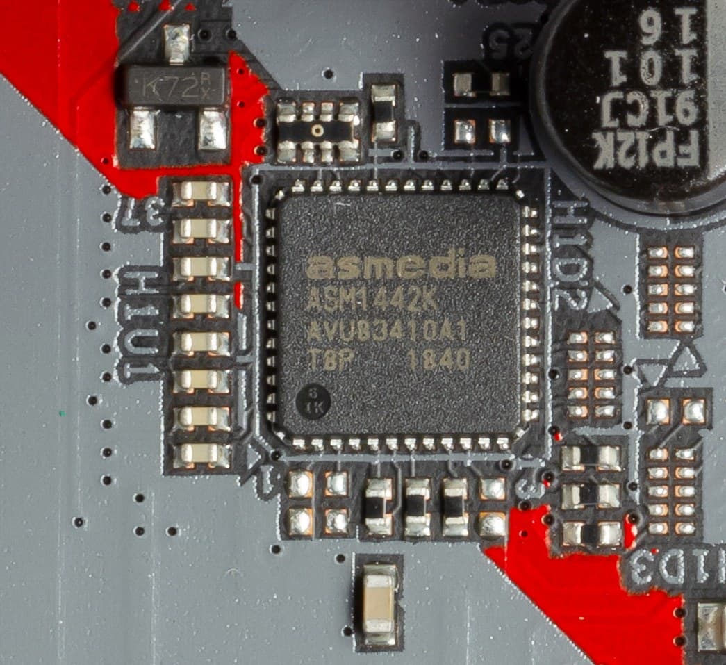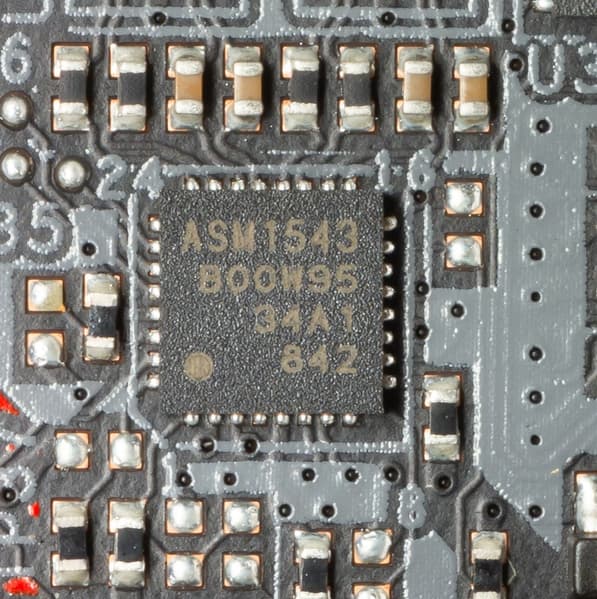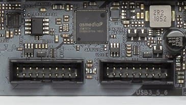 - 4 порта USB 3.1 Gen1: реализованы ASM1074 от ASMedia и представлены 2 внутренними разъемами на материнской плате (каждый на 2 порта);