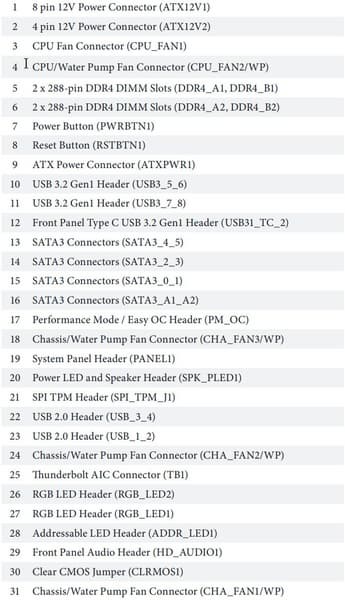| Прочие внутренние разъемы | 24-контактный разъем питания ATX 8-контактный разъем питания ATX12V 4-контактный разъем питания ATX12V 1 слот M.2 (E-key) для адаптера беспроводных сетей 1 разъем для подключения порта USB 3.1 Gen2 Type-C 2 разъема для подключения 4 портов USB 3.1 Gen1 2 разъема для подключения 4 портов USB 2.0 5 разъемов для подключения 4-контактных вентиляторов 1 разъем Thunderbolt AIC 1 разъем для подключения адресуемой RGB-ленты 2 разъема для подключения неадресуемой RGB-ленты 1 разъем для переключения режимов разгона 1 разъем SPI TPM (Trusted Platform Module) 1 разъем сброса CMOS 1 дисплей кодов POST 1 кнопка включения питания (Power) 1 кнопка перезагрузки (Reset) |