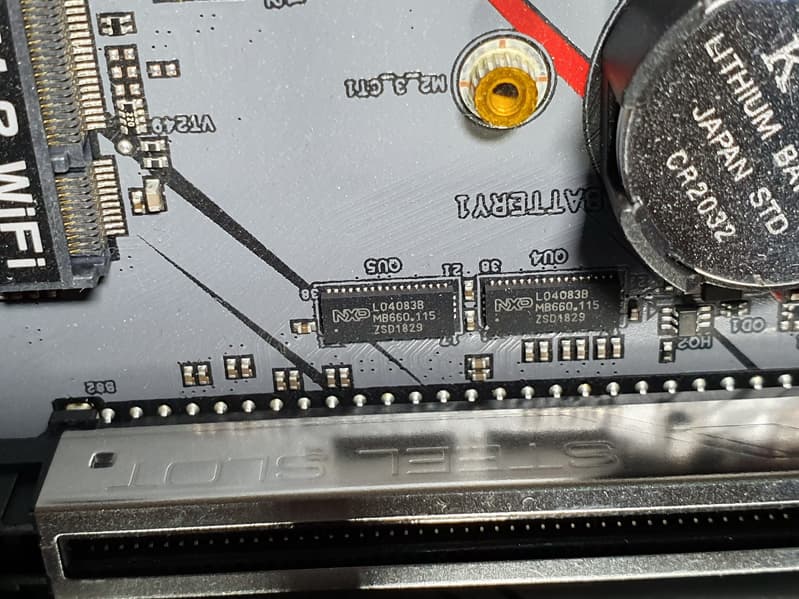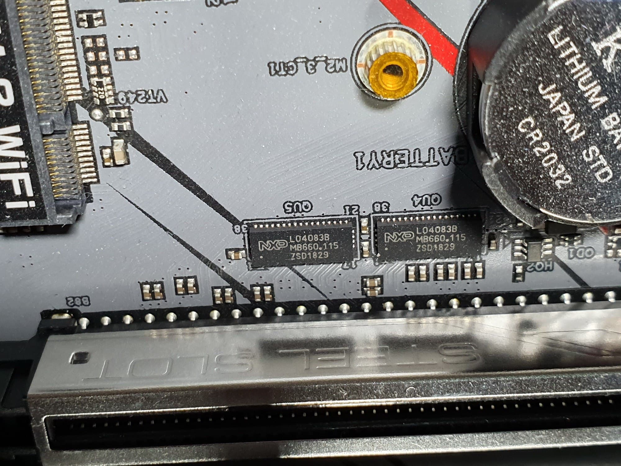 Распределением линий PCI-E между слотами в случае использования более одной видеокарты занимаются мультиплексоры NXP L04083B.