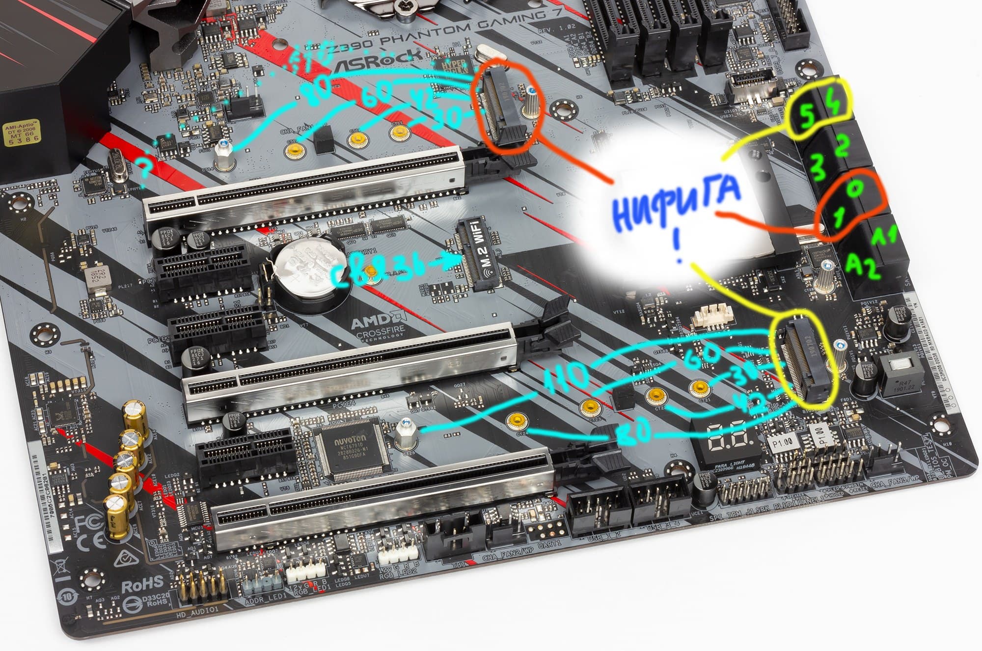 Самые длинные M.2-модули (22110) можно устанавливать только в нижний слот М2_2. Верхний слот M2_1 поддерживает модули только до 2280 (несмотря на то, что на сайте ASRock и в руководстве пользователя утверждается, что оба слота M.2 поддерживают модули 22110)
