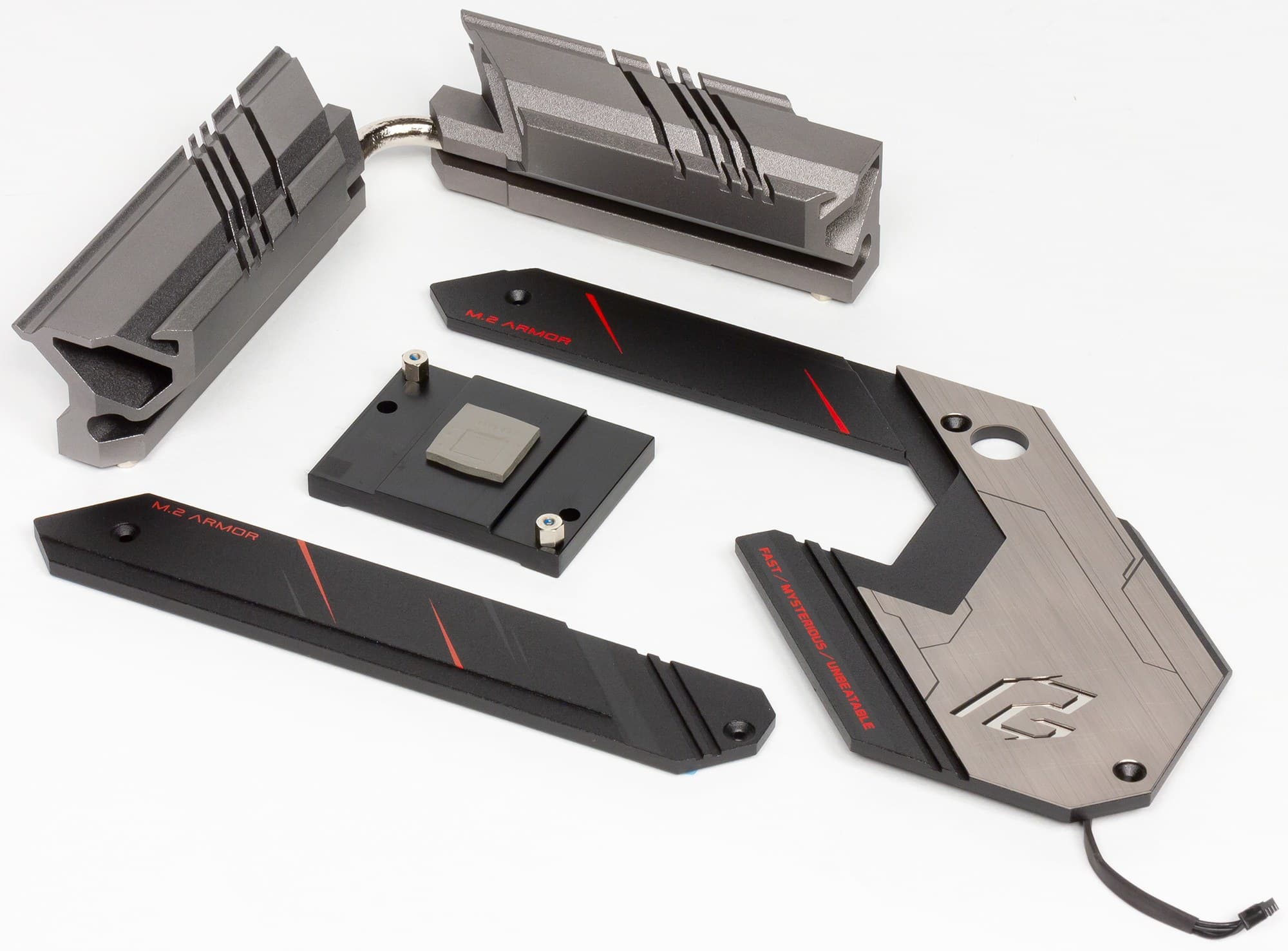 Чипсет имеет большой радиатор сложной формы со стилистическими острыми вырезами в соответствии с дизайном Phantom Gaming (также в него встроена подсветка логотипа серии). Внизу к нему пристыкован радиатор для M.2_2, сверху чипсетный радиатор пересекается с радиатором слота M.2_1.