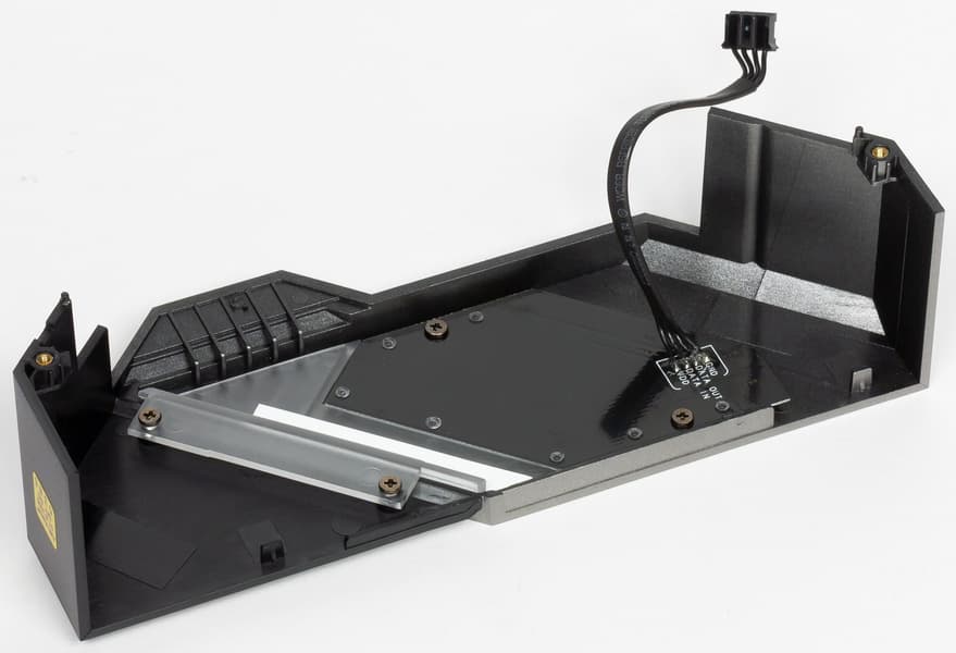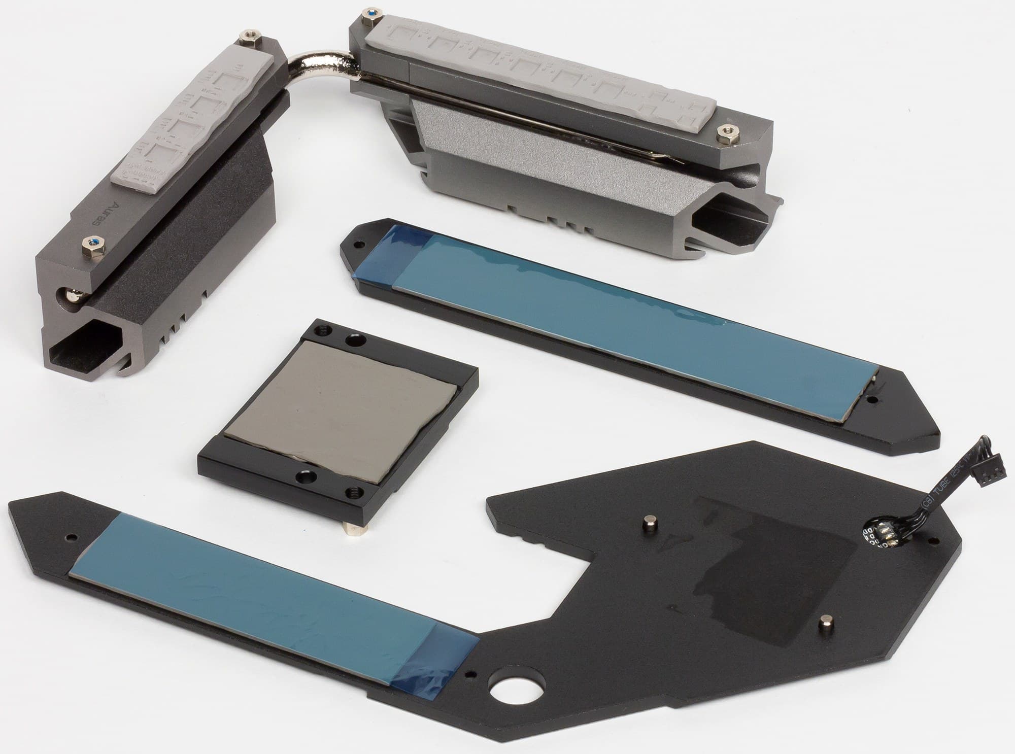 Силовые элементы преобразователя питания имеют свои два радиатора, соединенные под углом тепловой трубкой.