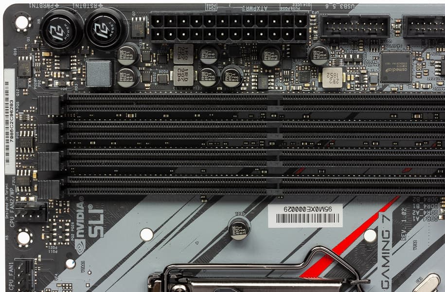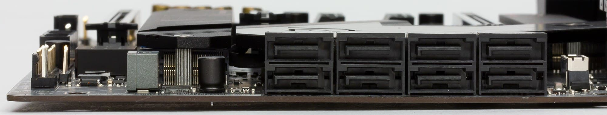 Всего у платы 8 разъемов Serial ATA 6 Гбит/с + 2 слота для накопителей в форм-факторе M.2. (Имеется еще один слот M.2, но он предназначен для контроллеров беспроводных сетей Wi-Fi/Bluetooth.)