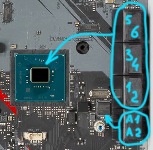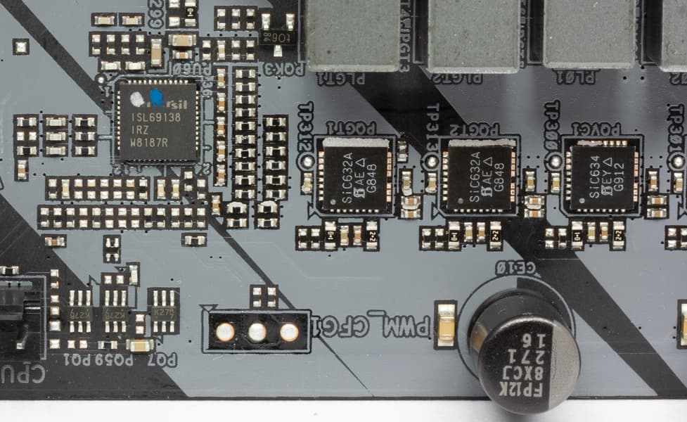 Оставшиеся 2 полноценные фазы для iCPU имеют DrMos SiC632. Каждый из 10 каналов имеет суперферритовую катушку 60А.