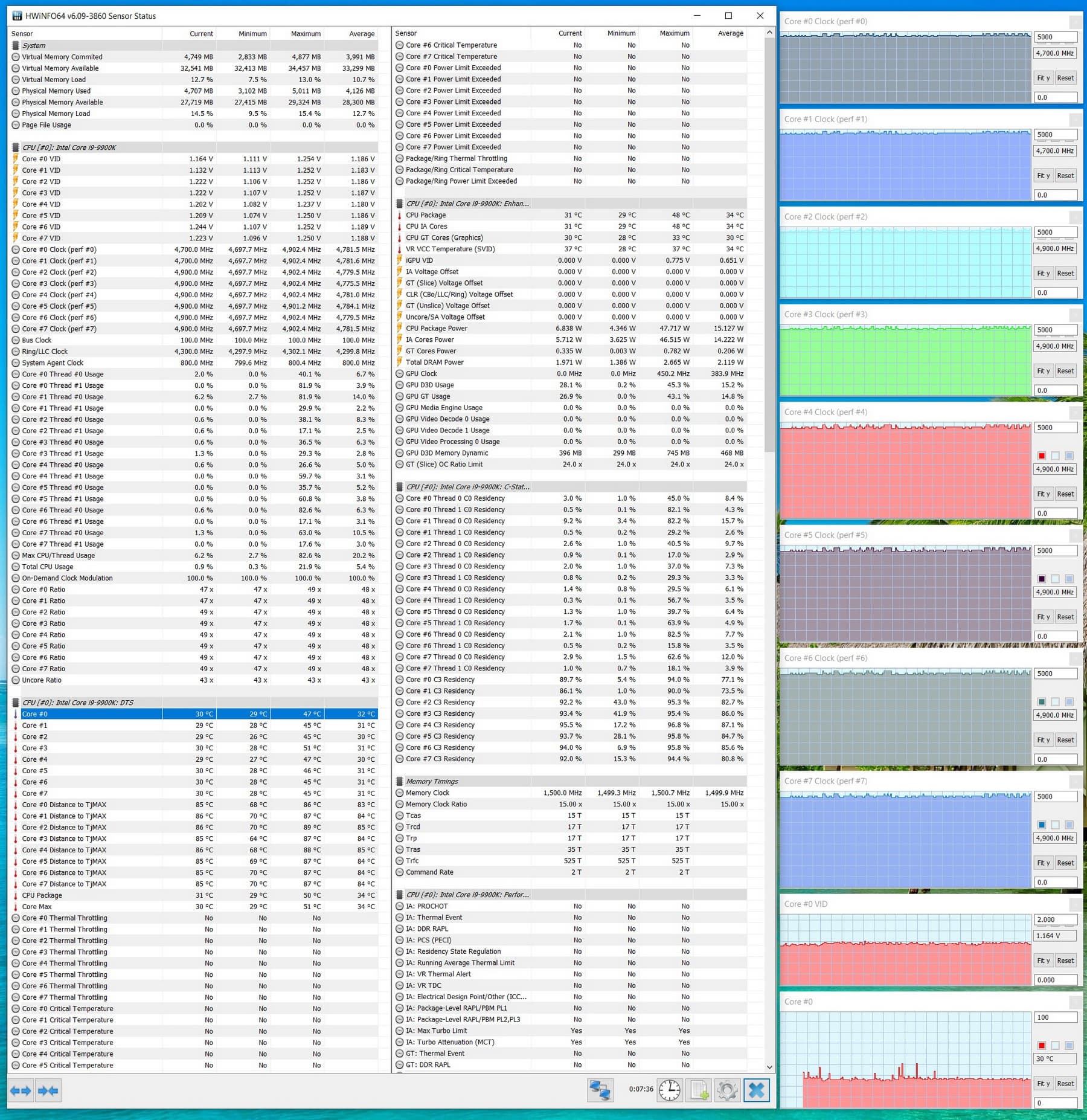 Смотреть работу нашей системы на настройках по умолчанию нет смысла: частоты «гуляют» по ядрам от 3,7 до 4,7 ГГц. Собственно, обычные «серые будни». Разумеется, Intel TurboBoost учитывает не только конкретную схему питания (а значит и модель/вендора), ревизию процессора, но и версию прошивки BIOS, поэтому частоты, автоматически поднимаемые на одном и том же процессоре, будут отличаться на разных материнских платах. Впрочем, на производительности это особо не скажется: проверялось и не раз: не выше 1%-2%.
