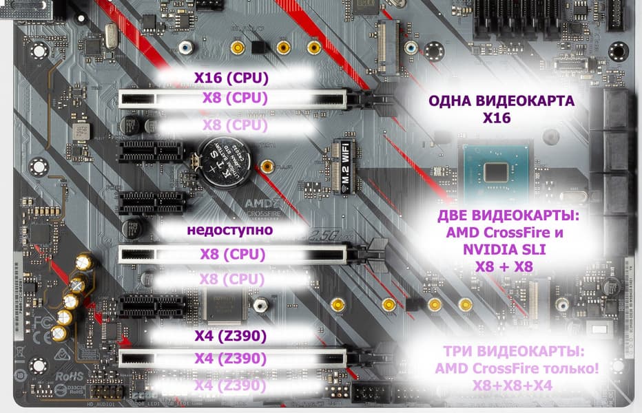 То есть полноценно получит 16 линий PCI-E только одиночная видеокарта, а «дуэт» из двух видеокарт в режиме SLI/CrossFire получит по 8 линий на каждый слот. Если использовать комбинацию из трех видеокарт (на сегодня это актуально только для технологии AMD CrossFireX), то первая и вторая карты получат по 8 линий, а третья — 4 (собственно, третий «длинный» слот всегда получает 4). Сильно ли это снижение количества линий на каждый слот ударит по производительности в целом? В случае двух карты -ощутимо, но не так уж сильно. А вот установка одновременно трех видеокарт уже кажется непрактичным решением.