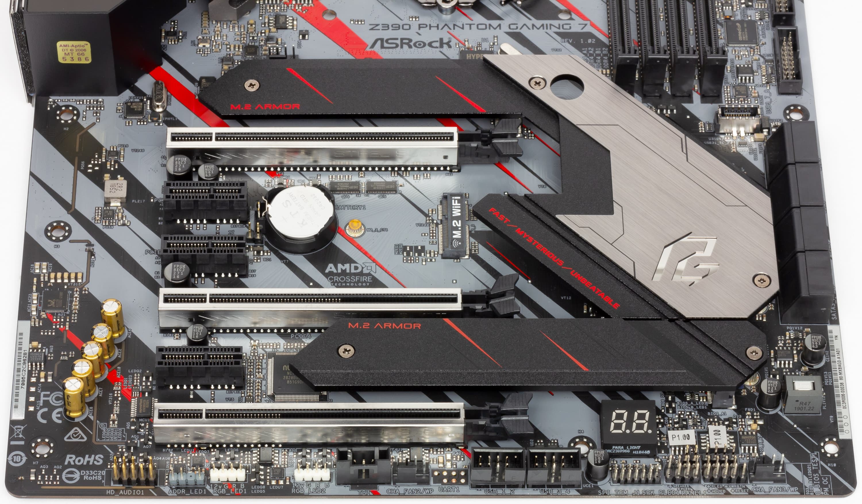 ASRock Z390 Phantom Gaming 7 — это хороший компромиссный вариант, в котором реализованы возможности топового чипсета Z390 и самых флагманских на сегодня решений Intel для рынка десктопов. Да, это не флагман, излишних наворотов тут нет, однако имеются и дополнительные «фишки» в виде второго Ethernet-контроллера (2,5 Гбит/с), восьми портов SATA, и хотя количество слотов M.2 меньше трех (как у флагманов), но есть слот для беспроводного сетевого адаптера. А имеющиеся два слота M.2 оснащены радиаторами — правда, установка модуля в М2_1 (первый слот) серьезно осложнена из-за общего с чипсетом радиатора (для демонтажа которого придется вывинчивать винты с оборотной стороны платы).