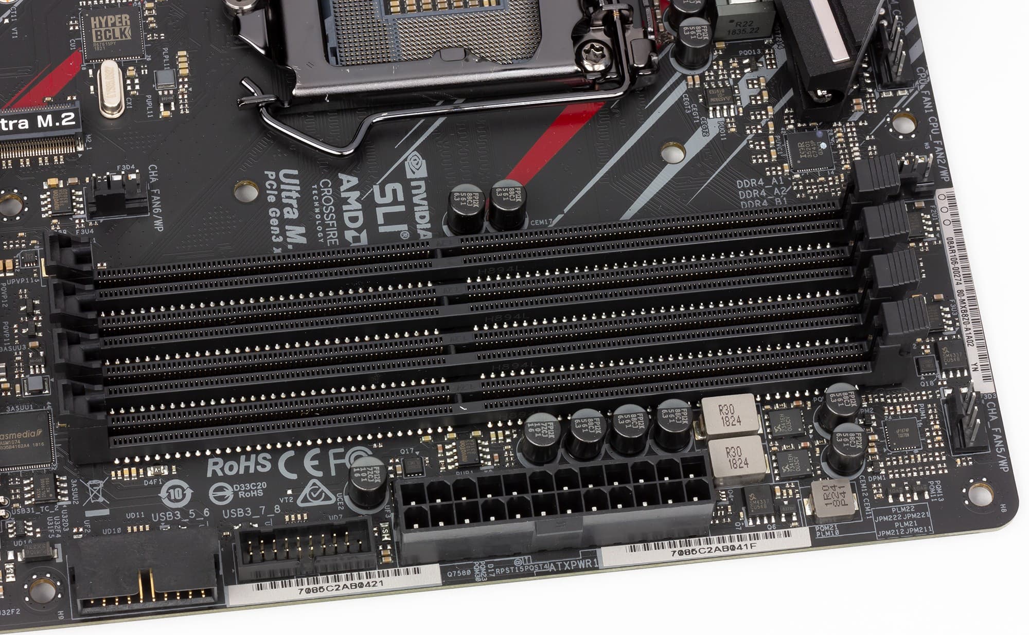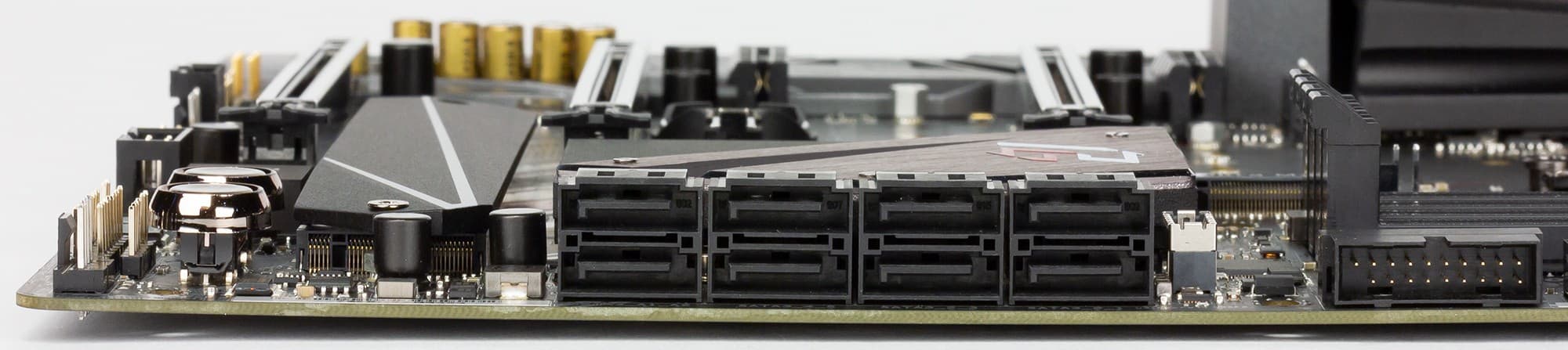 Всего у платы 8 разъемов Serial ATA 6 Гбит/с + 3 слота для накопителей в форм-факторе M.2. (Еще один слот M.2, спрятанный под кожухом блока разъемов задней панели, занят контроллером беспроводных сетей Wi-Fi/Bluetooth.)