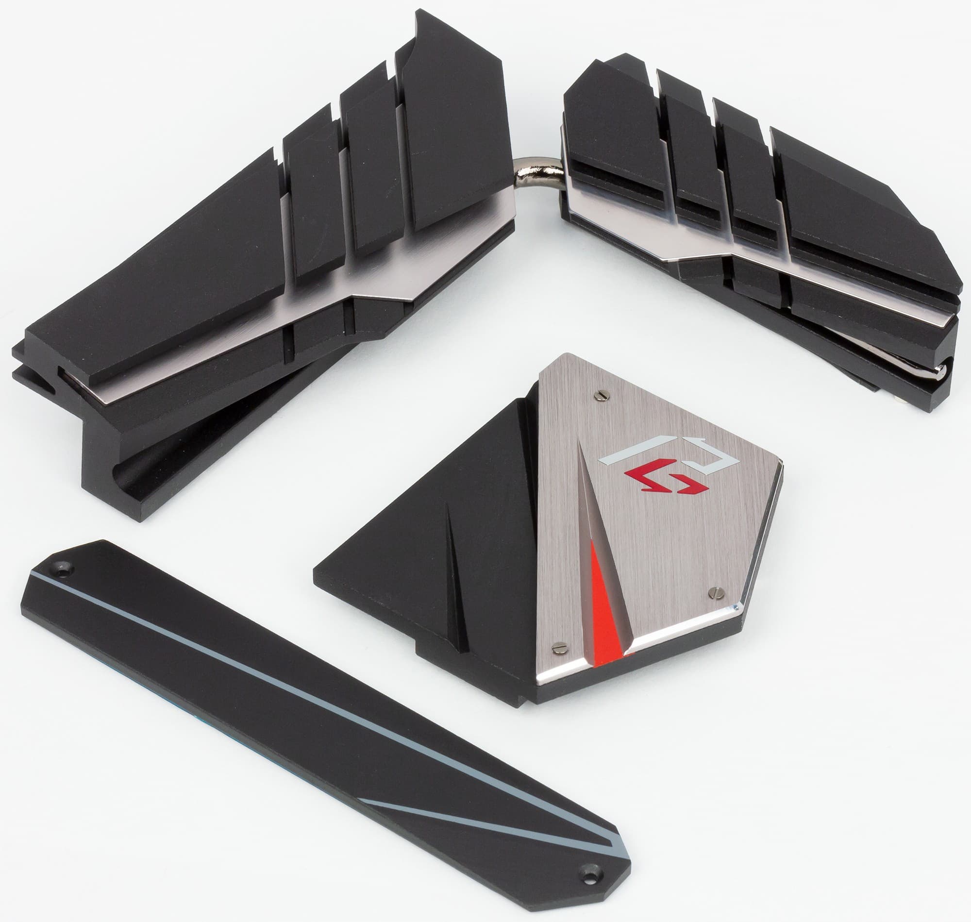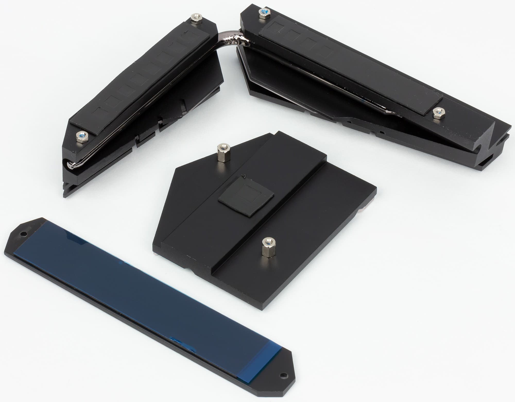 Также в комплекте охлаждающих радиаторов мы видим ранее упомянутый радиатор для нижнего слота M.2, снабженный термоинтерфейсом: вдруг установленный туда SSD перегреется и начнет троттлиться!