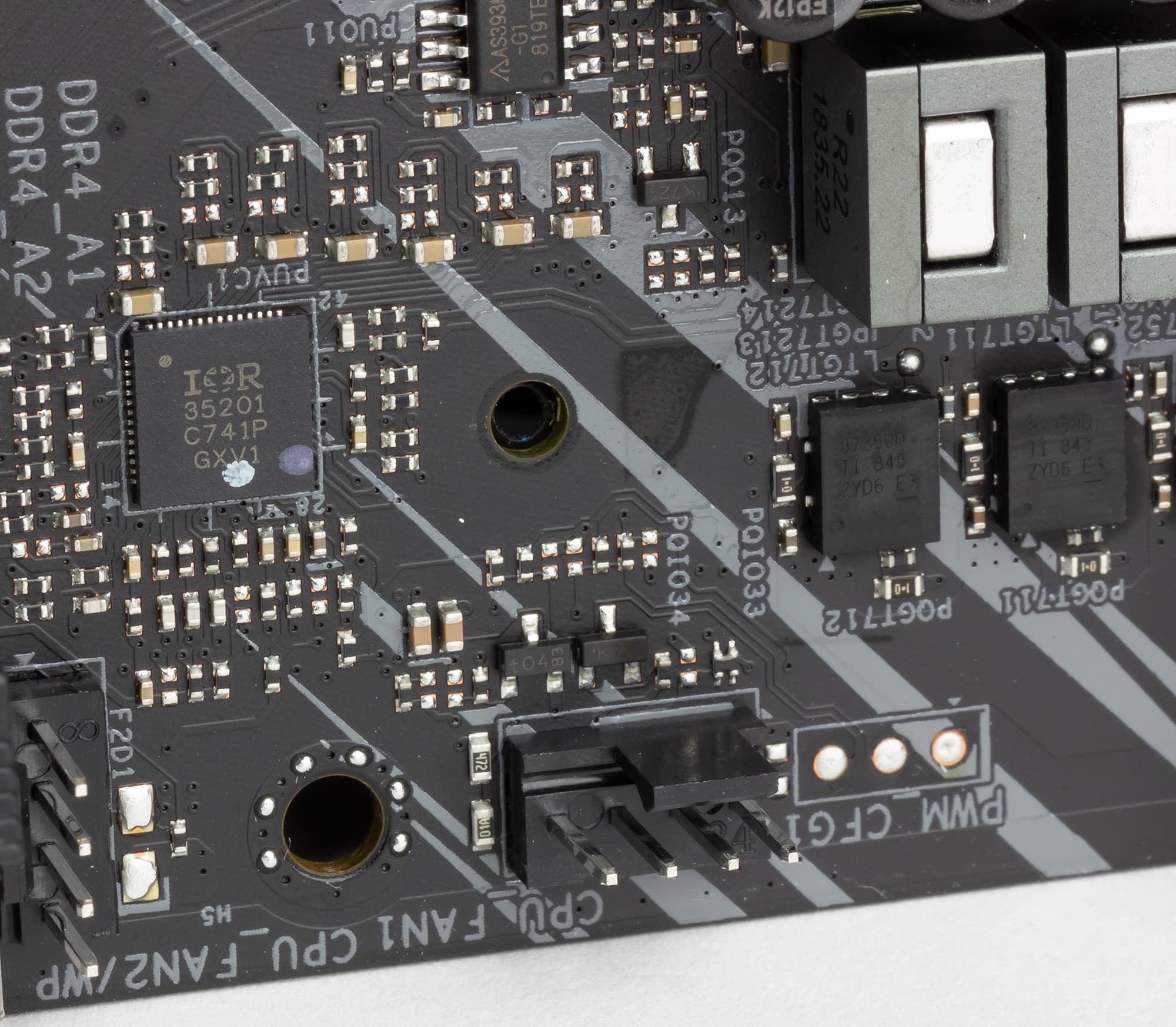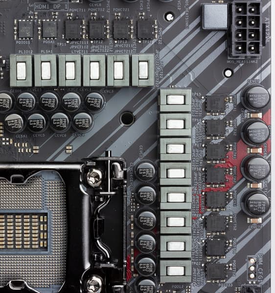 Очевидно наличие 14 каналов питания, из них 12 (10+2) относятся к VCore и iGPU, а остальные 2 — VCCIO и VCCSA. Однако установленный ШИМ-контроллер IR35201 (производства Infineon) поддерживает только 8 фаз.